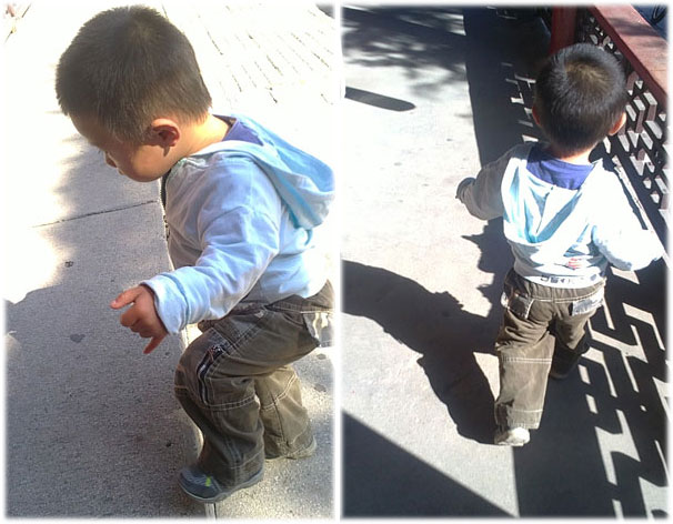 下楼的时候才叫一个费劲,小家伙不仅要求姥姥一路搀扶,中途还坐在台阶上说什么都不起来了,经过姥姥半天的耐心劝导,他才肯站起来继续走~~到了楼下,我们又陪他玩了好久,导演才喊我们过去试镜,那时其他人已经走得差不多了。听到两位导演说着孩子年龄的问题,一位嫌我们年龄大了(通知时说要一岁半的,可看这意思,感觉他好像想要个不到一岁的),另一位尽力说着好话,想着能凑合就凑合了~~ 经过他们好一番商量,最终勉强让秃秃在大白板前拍了两张照片,说如果录用的话,会再给我打电话的。看到当时的情景,我们都知道肯定没戏了,不过无所谓的,也没指望来这能得到些什么好处,最大的愿望就是可以多带孩子去个新鲜的地方转悠,只要孩子开心就好了。这次去试镜,我们最大的收获依然是,小家伙没哭没闹,乖巧的主动和叔叔阿姨打了招呼、道了别。再引用姥爷一句淳朴的话:甭管真的假的,我们也进了一回北影!嘿嘿~~