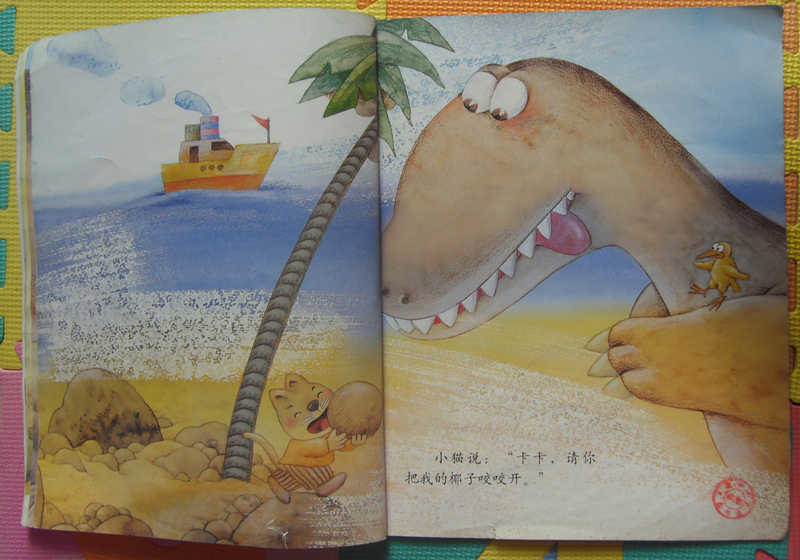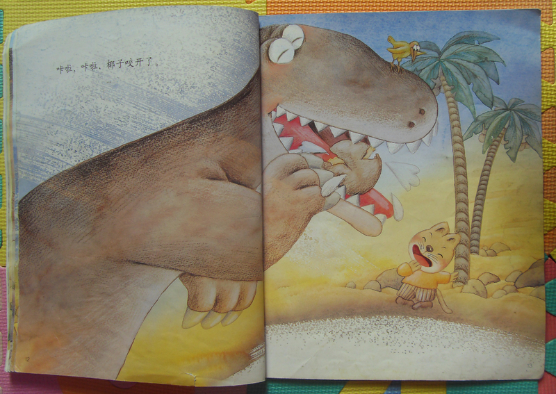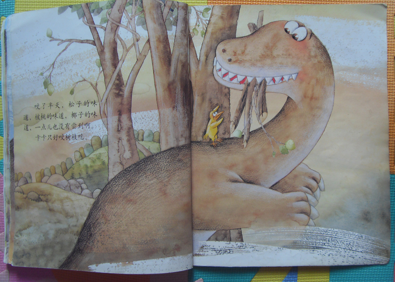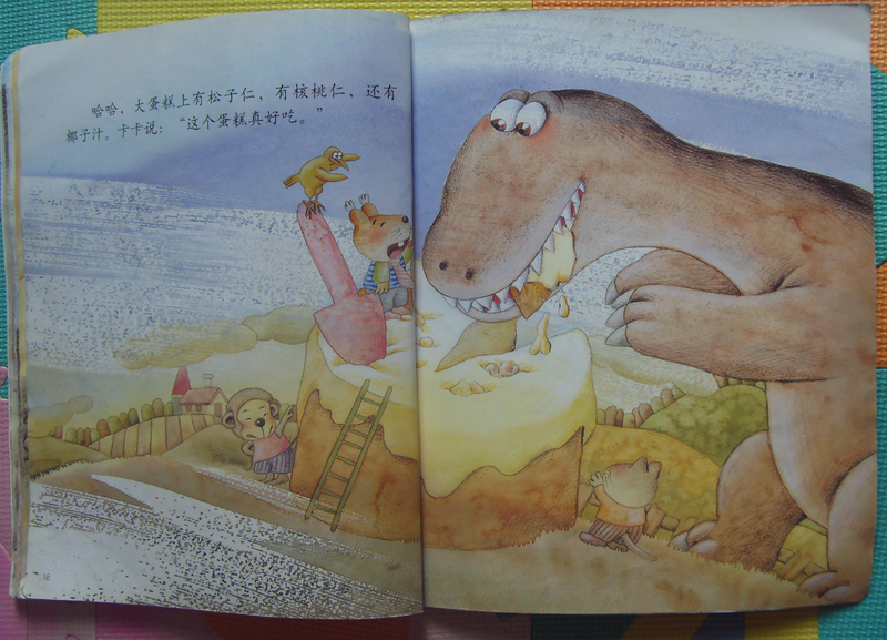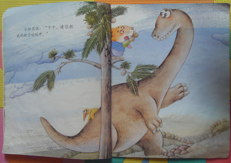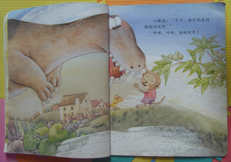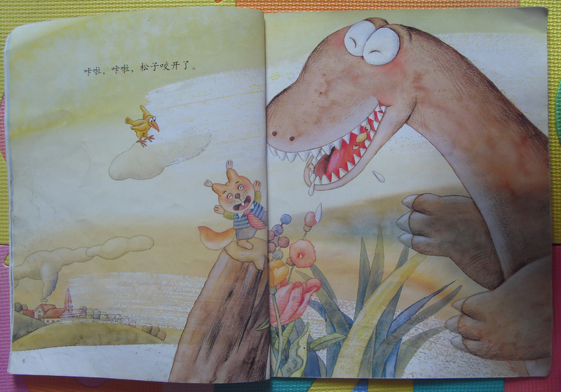 另外,细心的嘟嘟还发现了一只可爱的小鸟始终贯穿整个故事,它时候安静地站立在恐龙的身上,时而飞在半空中。嘟嘟说,小鸟肯定也是恐龙的好朋友。何尝不是呢? 尽管恐龙是个大块头,松鼠,猴子和小猫,当然还有小鸟,都是小不点儿,但是强与弱的差异,并没妨碍它们成为好朋友,因为它们都心怀友爱。