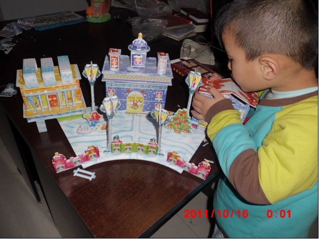 昨晚上睡得太晚了,今天上午10点才起床,再来看看,哪儿还没有完善!阳阳从我扔掉的垃圾里竟然有找到一个小卡片!插回了自己的作品中!ok,完工了!