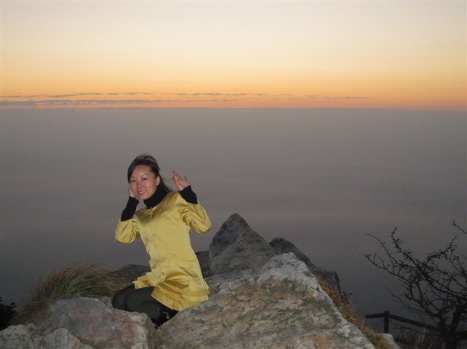 今天是上庐山的第二天,所以今天早上我们4:45分就从宾馆开始出发到五老峰看日出了(五老峰是庐山上最适合看日出的地方),三个人冒着黑夜、顶着满天的繁星向峰顶爬去,虽然一路上很累,但是想着一会壮观的一幕我们不禁加快了脚步,宁可早一点也不能错过日头红晕,虽然赶到山顶的时候时间还尚早,但是站在顶峰感受着一阵阵的冷风袭来,看着山下寂静的山谷又是别样的感觉。终于在我们的期盼和等待中我们正前方的东方,开始微微泛白,接着出现了好多云朵似万马奔腾,又大概等待了十几分钟,东方就慢慢红了,几分钟的时间,太阳就慢慢浮上了云层,一点一点的探出来了,似火红的灯笼挂在天与地之间,我们不禁感叹到大自然的神奇和壮观,当整个太阳照在我们身上的时候,感觉全身都是暖的,那种感觉难以用语言来诠释,太美了......此刻最遗憾的就是我们没有专业的相机来记录这动态的一幕,只能用自己的普通相机来留下些回忆,拍出来的效果感觉都有点对不起这美丽的场景,O(∩_∩)O~亲们就将就看一下,但是值得申明的是真景绝对比看到的照片要美的多......