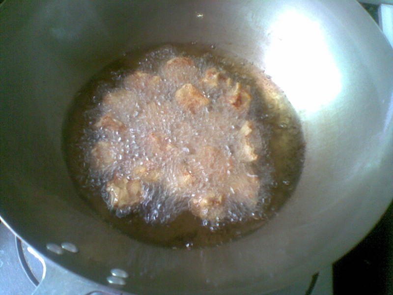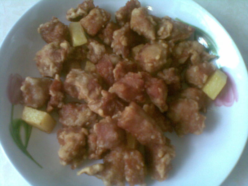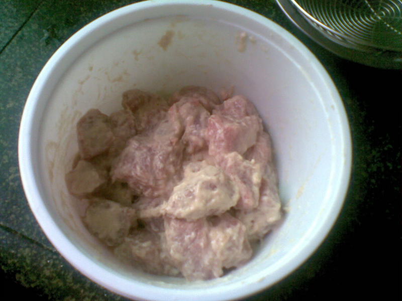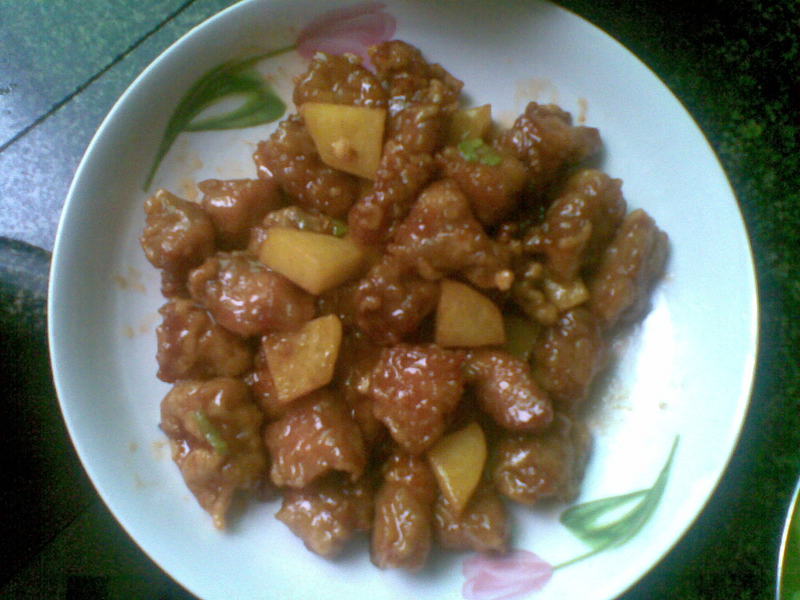 原料:猪肉,土豆,葱,蒜,姜,番茄酱,盐,味精,香油,五香粉,白砂糖,醋,料酒喜欢辣的也可以加辣椒粉。 买了半斤多的猪瘦肉(用五花肉更好吃,但是我弟弟不吃肥肉),切成差不多2cm的正方块,放入盐、少量味精、生粉,和一点水研制十几分钟。 ![]() 番茄酱,盐,味精,香油,五香粉,白砂糖,醋,料酒根据自己的口味调成卤汁。醋不要放太多,喜欢甜的多放糖。其实这个卤汁根据自己的口味都可以调的。呵呵、 ![]() 土豆切块:(土豆刚好没有了,所以就一点点) ![]() 放入锅里炸十来分钟: ![]() 炸好的肉块和土豆: ![]() 另起锅,热锅,下油,放入蒜末和葱末和一点姜煸炒,倒入卤汁,调成糊状倒入炸好的肉块和土豆,翻炒一会儿就ok啦。 ![]() 这个菜很简单吧,我第一次做呢,大家就支持支持我吧。弟弟说很好吃,今天一下子吃了三碗饭,我也后悔自己做的太少。自己吃一点也不讲究,真正的荔枝肉,要切横竖刀痕,炸出来的就像荔枝一样,完了在上面撒点芝麻葱花之类的,拌些黄瓜,红绿白相间,色香味俱全了。 人家做的就是不一样