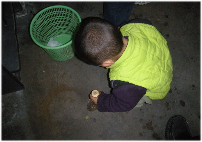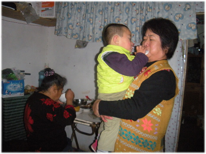 看到姥爷递过来的小酒瓶,秃秃立刻忘记了之前夺酒杯的事情,自己捧着酒瓶就跑到一边去玩了。他先来到另一个桌子前,高高的举起小酒瓶,假装给桌上的饭盒斟满了酒~~可他还是嫌自己玩过家家的游戏不够过瘾,又跑到饭桌前伸手去捣乱,结果被姥姥给轰走了,自己灰溜溜的蹲在地上,摆弄起小酒瓶来…… 这个酒瓶真是结实,任秃秃用力在水泥地上墩了好几下,愣是纹丝没坏!可我们看着实在觉得危险,命令他不许再往地上摔瓶子了,于是秃秃转战到椅子上去磕哒~~等姥姥把饭全都做好了,大家把桌子抬回到墙边去,纷纷坐在桌旁开始吃饭时,秃秃还没饿,他就抱着酒瓶满屋子转悠,继续寻找新的玩耍目标…… 奶奶喊他赶紧过去吃饭,他却耍赖的冲奶奶伸手、让奶奶抱,弄的奶奶也没能及时吃上饭呢~~舍不得饿到孙子的奶奶,拿了片白萝卜让小家伙啃,秃秃表现相当的好哦,不但自己啃了几口,还拿了一片塞到奶奶嘴里,让奶奶也和他一起吃呢!当时真把奶奶给乐坏了,鼓着嘴连连夸赞秃秃是个懂事的好孙子~~