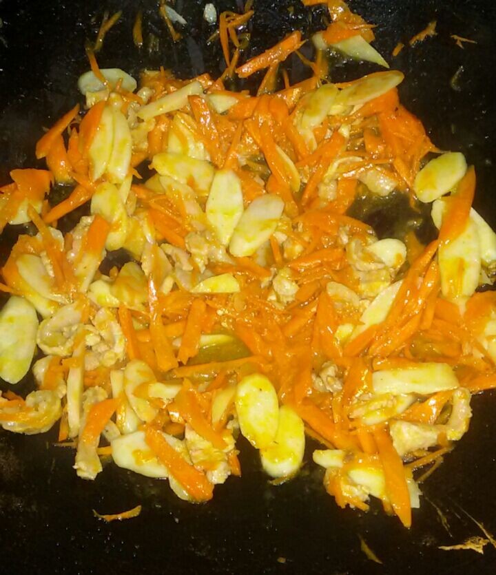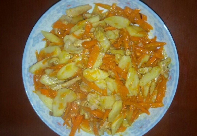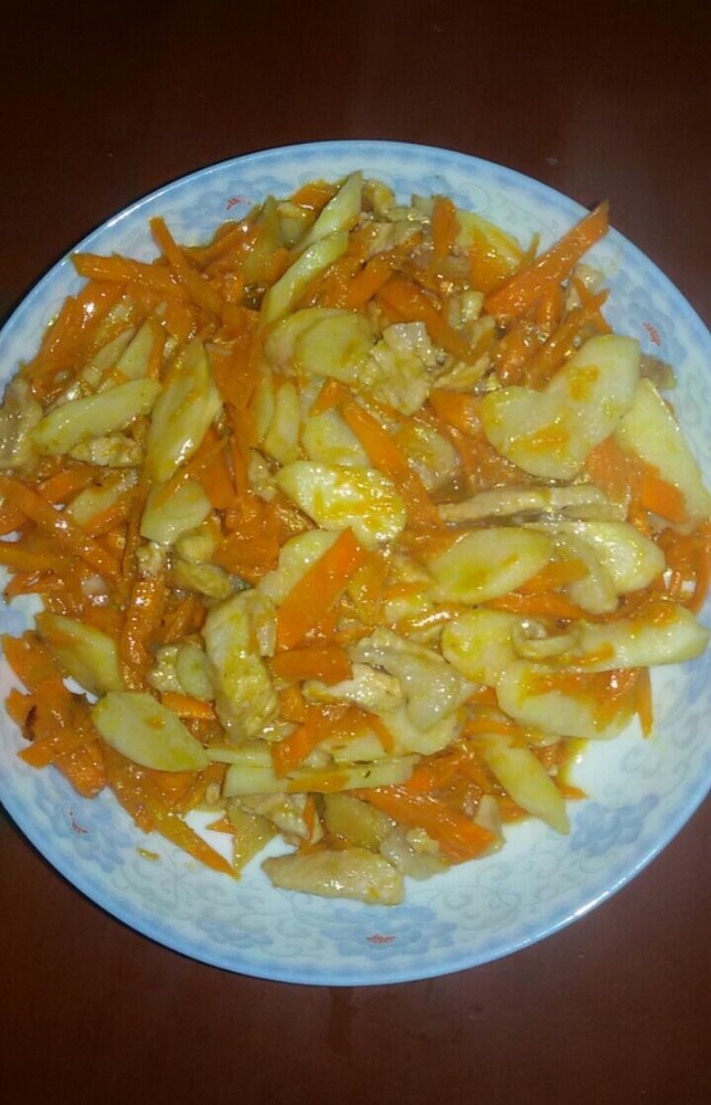 那天下午,宝爸突然打电话给我叫我晚上煮他的饭,然后我就顺口问他想吃什么菜?然后他回答说要吃鸡肉,然后我就说不如你在乡镇那些市场买吧,我们这的肉鸡一点都不好吃,然后宝爸也答应了,回来的时候不但买了鸡肉,还买了一大袋的胡萝卜。 我一看这些胡萝卜我就头疼了,其实我是一个不太喜欢吃胡萝卜的人,小不点也是,可听说孩子多吃胡萝卜对身体很好,然后我平时也就买那么一两根回来,然后变着花样做给小家伙吃。可那天宝爸一下子买了好多的胡萝卜,而我又不想放太久,所以我不得不想法子来做胡萝卜了。 ![]() 胡萝卜粥、胡萝卜汤、胡萝卜鸡蛋煮饼我都做过了,小不点也喜欢吃,可我又不能天天这样做,所以我就想到炒胡萝卜了,可用什么炒呢?如果是胡萝卜炒胡萝卜,估计小不点也不喜欢吃,然后我就想到了用猪瘦肉来炒胡萝卜了。看到家里还有半根铁棍山药,加上上次到朋友家吃过一次山药炒瘦肉,觉得很好吃,然后我就琢磨着用山药瘦肉来炒胡萝卜了,这样做出来的效果应该很不错的。 做这菜时,胡萝卜应该是切片的,但我一想到小不点从不吃切片的胡萝卜,然后我就想把胡萝卜都擦成丝,这样小家伙就会接受胡萝卜了。果不出我所料,小不点一点都不嫌弃这些炒过的胡萝卜丝,而且吃得津津有味。而我本人也是觉得这菜蛮不错的,炒过的山药脆脆的,比煲山药口感好很多,而胡萝卜因为吸收了瘦肉的精华,所以吃起来特别清甜。下面跟大家说一下胡萝卜山药炒瘦肉的做法。 ![]() 材料准备: 胡萝卜一根(约300克)、铁棍山药约200克、猪瘦肉(板根部分)250克、生姜三片、葱头一只 步骤: 1、胡萝卜洗净,去皮,擦成胡萝卜丝,备用; 2、铁棍山药洗净,削去皮,切成薄片,备用; 3、猪瘦肉洗净,切薄片,用生粉腌一下,备用; 4、生姜片洗净、葱头去衣,拍碎,备用; 5、锅洗净,烧热,加入适量的花生油,然后把生姜片、葱末放到锅里爆香,然后把上述所有材料一同入锅内翻炒,加入少量的清水继续炒,快炒熟后调入生粉水(酱油、蚝油、生粉、食盐和水调成),待汤汁收干后即可关火出锅食用。