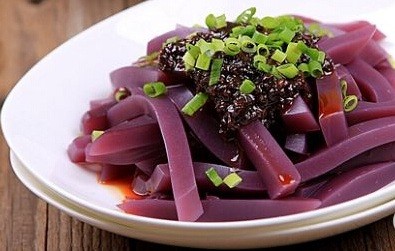 豌豆紫薯凉粉,豌豆粉75克,紫薯粉25克。 先加200克水调到没颗粒,再加500克水,大火加热,至沸腾冒泡,中间一直得不停地搅拌避免糊底。 转为中火再继续搅5分钟,做好的淀粉糊倒入容器中自然冷却后,切条凉拌,可以配点儿黄瓜丝好看。 ![]() 盛夏来一碗消热解暑,还是不错的。