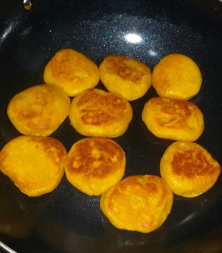 南瓜泥 2、浅盘子一个,然后把南瓜泥、糯米粉、自发糕粉混合在一起,搅匀,揉成面团,备用; 3、取小一块揉成圆形,然后放不粘锅内煎,并时不时翻面,煎至南瓜饼熟后即可出锅晾凉食用。