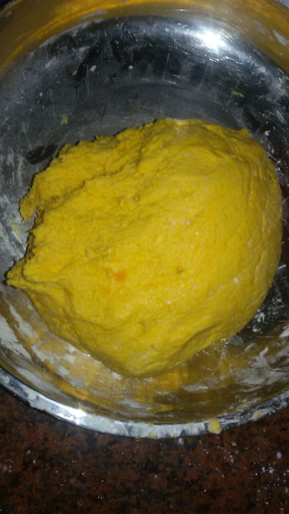 昨天一大早家里就突然停电了,无奈之下我们只好起床。考虑到自己曾答应过小不点给他做南瓜饼,而且家里也有做南瓜饼的材料,然后我就琢磨着做南瓜饼了。虽然家里停电了,但由于还有煤气炉用,所以并不影响我们做南瓜饼。南瓜煮好以后,我本想自己来揉面团的,哪想到宝爸看到后竟然主动帮忙,然后我就干脆全部把这工作全部交给宝爸来做了,而我则在他旁边打下手。 面团揉到一半的时候,宝爸说要再加些糯米粉进去揉,我听了就告诉他家里已经没糯米粉了,该怎么办?然后宝爸就淡定地说用自发糕粉吧,我不解,然后他就说上次做蛋糕的时候不是还有半包自发糕粉没用完吗?然后我就把它找了出来,接着宝爸就把半包的自发糕粉全倒在面团里面去了,而且刚刚够用。面团揉好后,我就问他这些能做包子吗?宝爸竟然回答说可以,接着就弄了几个来蒸,遗憾的是包子并未做成功,但味道也不差,小不点也喜欢吃。