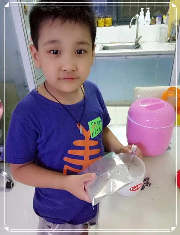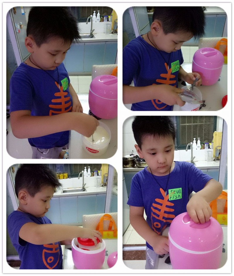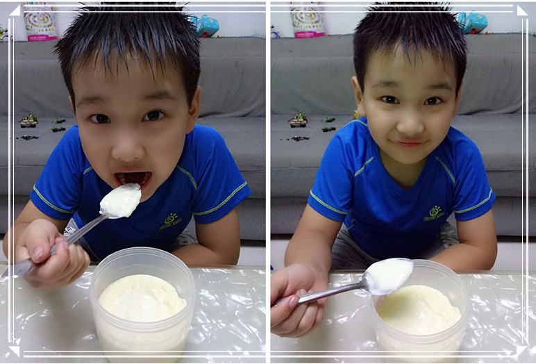 夏天吃冰淇淋是最正常不过的了,往年夏天我都会批发很多冰淇淋放在冰箱里,等待着Aric的“临幸”。不过今年的夏天嘛,我们就不再买了,而是自己做,因为Aric已经可以自己做冰淇淋,懂得健康饮食的重要性了。家里有一台酸奶机,非常非常适合我这个对做酸奶和冷饮没感觉的妈妈,也让Aric特别欣喜自己可以尝试为妈妈做好吃的了。小暖男的特质毫无遗漏的展现了出来,总结下来就是一个懒妈妈成就一个小暖男,当然小暖男更是妈妈最贴心、最懂事的宝贝,照顾妈妈毫不迟疑。 首先就是做酸奶了,有多简单?一包酸奶粉+几杯温凉水+耐心的等待,搞定一份香甜可口的酸奶。在前一天Aric就选好了自己爱吃的椰子口味酸奶粉,然后倒入已经装好温凉水的容器中。对Aric来说最麻烦的就是搅拌过程,男孩子嘛,搅拌中总是不会耐心的去沿着顺时针的方向轻轻搅拌,反而力气过大会导致水洒出来。于是他搅拌我擦桌子,不一会儿我就有点压不住烦躁。不过Aric特别会看眼色,看到妈妈有点不开心了,放慢了手上的动作,直到搅拌完成装入酸奶机中,只需要等待10个小时左右就好了。