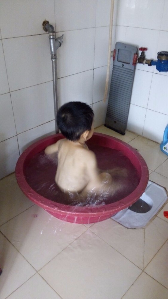 小孩子喜欢玩水,在盆里也玩得开心