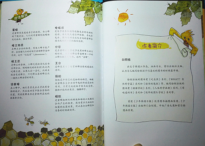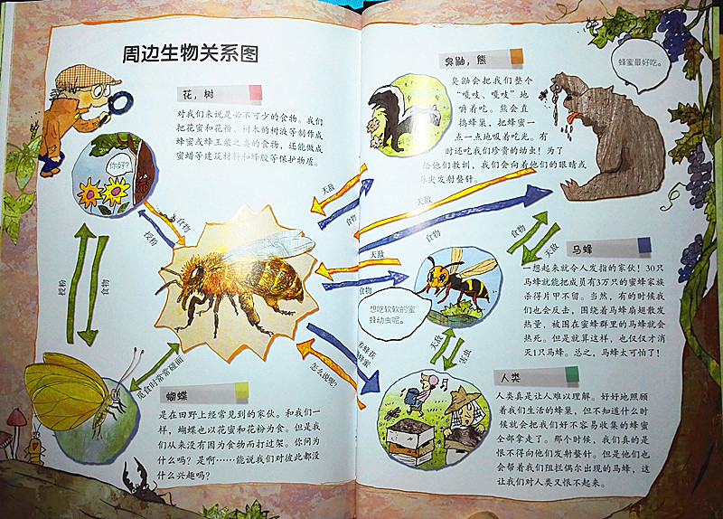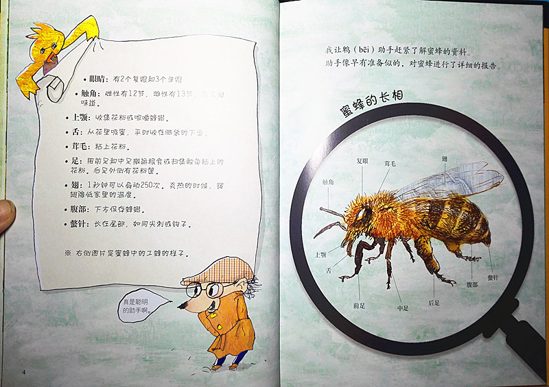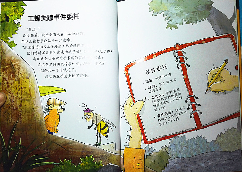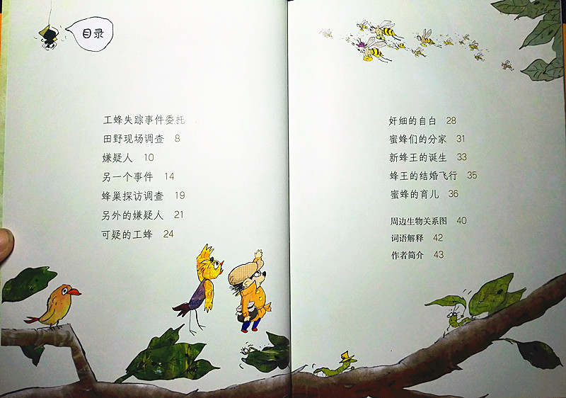 果然,打开《蜜蜂家族的失踪事件》,串串侦探就发布了“案情”: 10只去收集蜂蜜的蜜蜂离家后失踪了,而这个案子的嫌疑人就是长相难看凶恶的马蜂。故事看来很精彩。而他的助手鹎(一种可爱的鸟儿)则详细介绍了全书的结构,有文字、贴士、笔记本、周边生物关系图和词语解释,想来知识的严谨性也是既有保障的。
