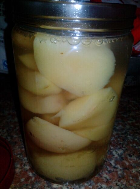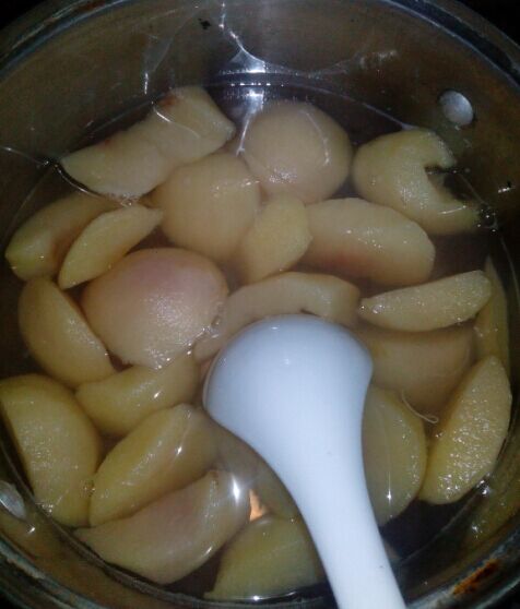 昨天一下子买了十五块钱的桃子,两块一斤,整整一方便袋子的桃子,特别的沉,这么多的桃子,真担心会放坏了,本来不想买这么多的,就是自己耳朵根子软,卖桃子的女摊贩把自己家的桃子夸的天花乱坠的,如何甜,如何好吃,本来我都装好上称了,本来十块钱的就不少,她还一个劲儿的帮我装,硬是凑了十五块钱的,还跟我讲可以做成桃子罐头,另外又送了我几个有虫眼的,挤了的,说把虫眼和挤的挖去做罐头一样吃的。就这样,我拎了一大袋子桃子回来了。 到了晚上的时候,我就着手做桃罐头了,提前买了那种发黄的冰糖,这种冰糖比白冰糖贵一些,个人觉得会好,而且是整个的一大块一大块的,我先把桃子清洗干净,再把不好的地方挖去,还把皮都削干净了,再切的一块一块的,洗一洗,把不锈钢汤锅里放好水,把桃子放进去,还有冰糖放了跟孩子拳头大那么一块,开火煮,开锅后又小火煮了十来分钟,关火,此时的汤水有些变稠了,桃子也变的糯糯的了,正是我喜欢的口感。