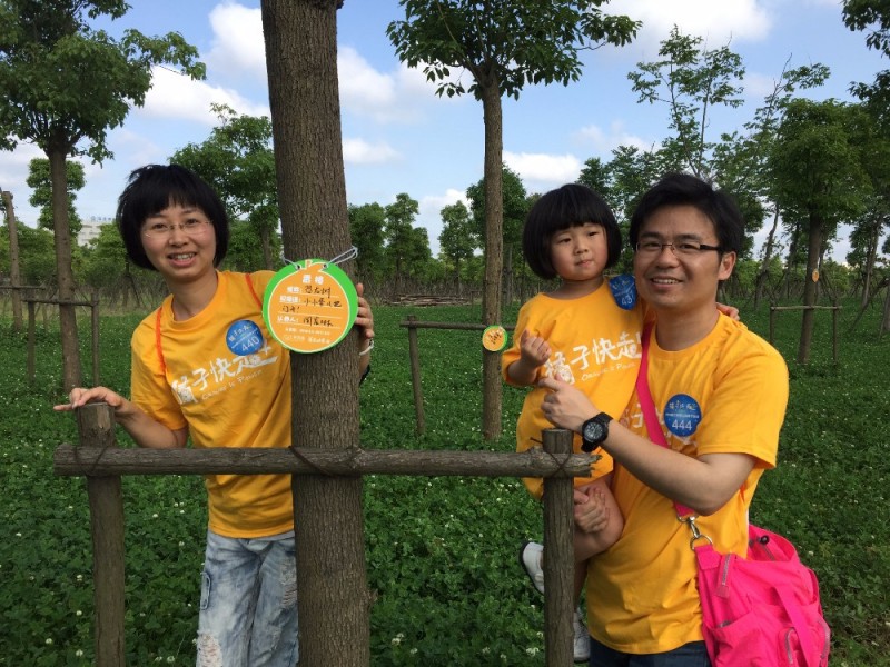 跑到半程我们就发现了本次活动的另一个重点“认养绿植”,我们拿出包里发的卡片,郑重的填上宝宝姓名和祝福语,挂在心爱的小树上,希望它快高长大。这也是森兰集团的一个公益项目,被挂认养牌的小树将有森兰集团统一出资认养,为期一年。也希望通过这个活动森兰体育公园的绿地能更繁茂。小妞为小树取名恐龙树,因为她是一个小小恐龙迷,寄语“小小蛋儿把门开”那是因为六一儿童节时她们班表演的节目就有这句经典台词。我们也趁此机会稍作休息和调整,向终点发起冲刺。