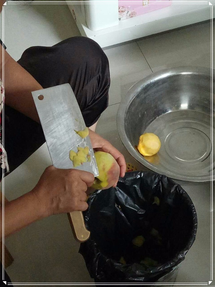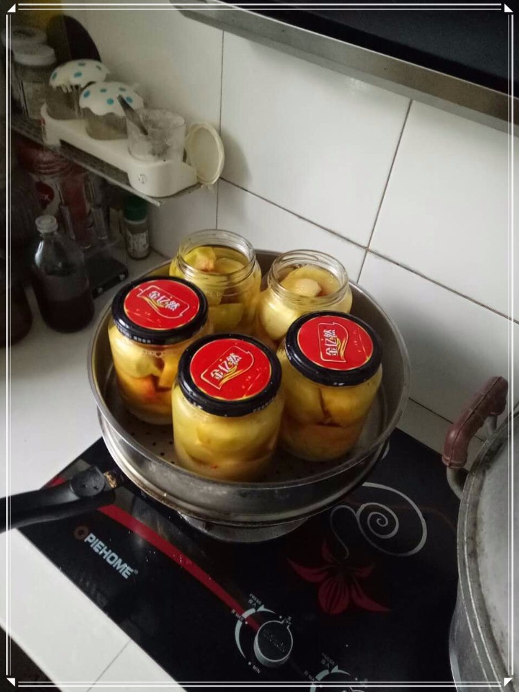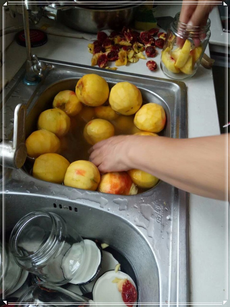 说一下制作过程吧,其实非常的简单,我们每个人都可以做,只是可能没我妈这种魄力做上一百多瓶。没办法,亲戚朋友太多。就说我家吧,我、我妹、我弟,就得每家十几瓶打底。我妈有三个弟弟一个妹妹,也得送点吧,还不算那些侄子侄女的。我爸有三个哥哥一个姐姐两个妹妹,关系好的也会送一些,也不算那些外甥的。我妈还有几个闺蜜,咳咳,我也有,所以我们都得给人家送点,算是朋友之间的感情,送自家的东西更有意义嘛。而我每次去婆家也会带些回去,我妈说说亲家的来往。 1、黄桃削皮切片,装瓶备用。这是一个非常考验耐心的过程,我妈竟然用刀来削皮,因为黄桃太软无法用削皮器。切片后就依次装入瓶中,这个瓶子是我妈批发买回来的,加上盖子成本是一块多一个。而且瓶子的选择要好,否则会承受不了蒸的过程,也会蒸发出有害气体。