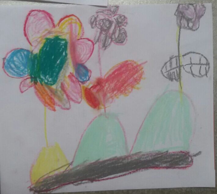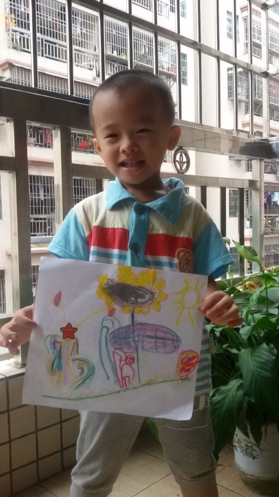 接下来,他又开始画第三幅画了,画的同样也是花,不过却多画了几座颜色亮丽的山,我问他为什么这么喜欢画花?然后他就说老师是女的,所以特别的喜欢花。呵呵……小家伙还蛮懂女人的心思的。