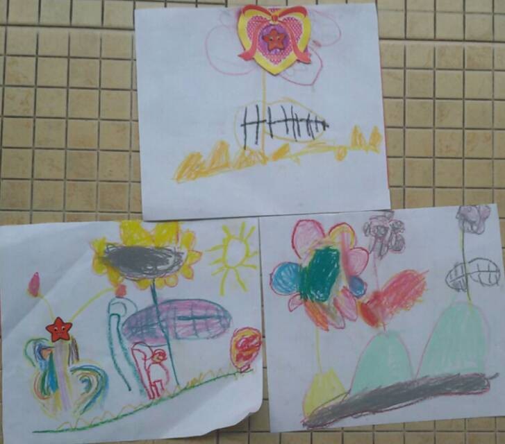 等小不点画完三幅画后,我也完成了几朵手工玫瑰花了,然后我就准备带他出去吃早餐了,吃完早餐好送他上学。可当小不点知道妈妈准备拿这些漂亮的玫瑰花送给他的老师时,小家伙竟然不舍得,说老师只喜欢他画的画,不喜欢这些玫瑰花,而且还说老师到时会把玫瑰花扔掉的。看到小不点这么坚持,然后我也就改变主意,不送老师手工玫瑰花了,他知道后可高兴了,还找了一个玻璃瓶子来摆放玫瑰花呢。 后来,小不点把这三幅画拿给老师时,老师当面夸奖了他,然后他就要求老师把他的画贴到教室的墙上。呵呵……小家伙也太自信了吧。