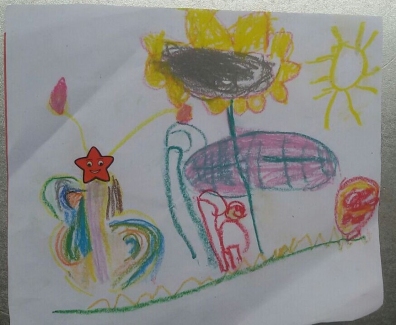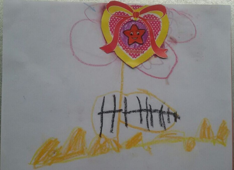 得到妈妈的夸奖后,小不点又开始画第二幅画了,只见他在上面画了道栅栏,然后就在上面画了朵大大的花,可涂颜色的时候他涂坏了所以他就没有继续画下去,但他却把俺放在旁边的心形图案用上了,取来双面胶把它胶在花朵上面,这样一幅简单的画就算完成了。