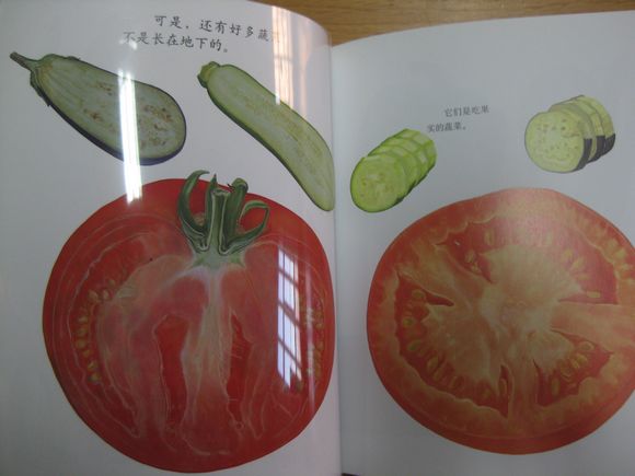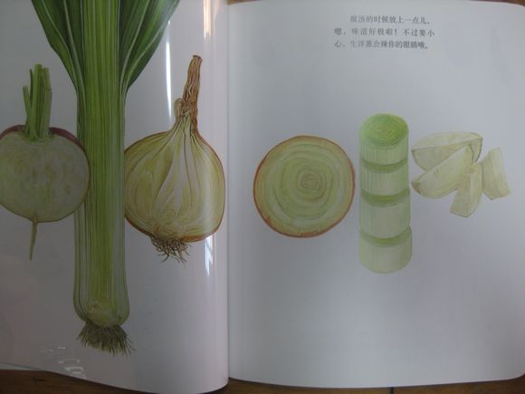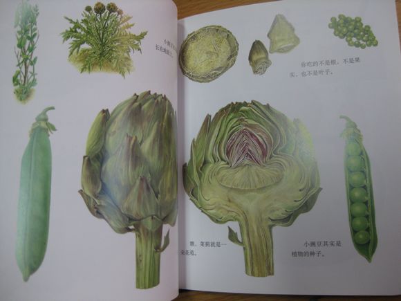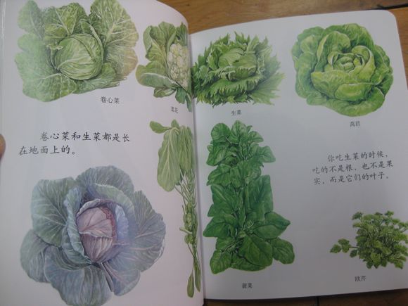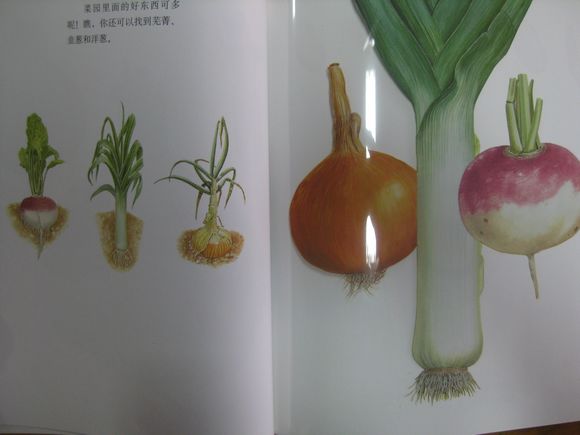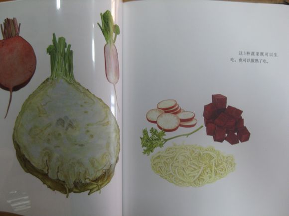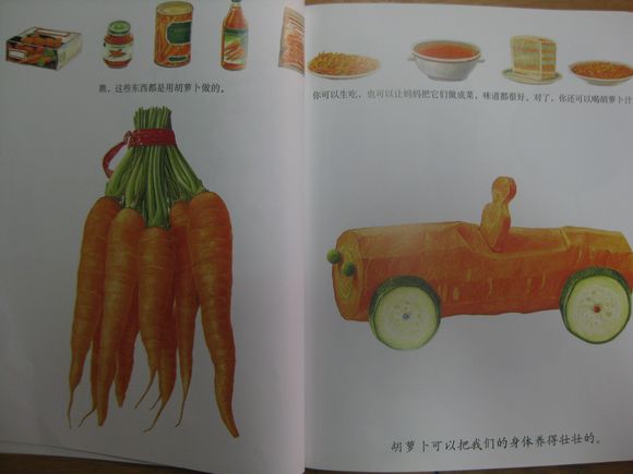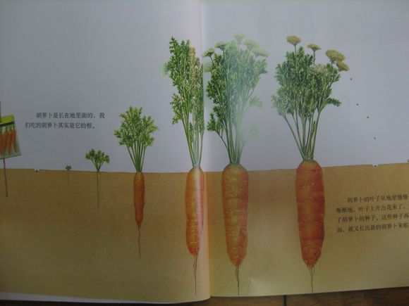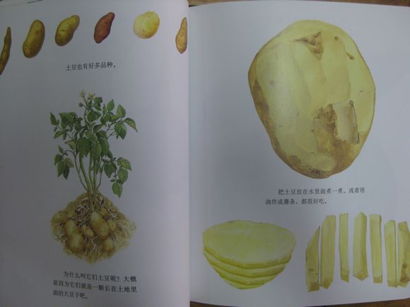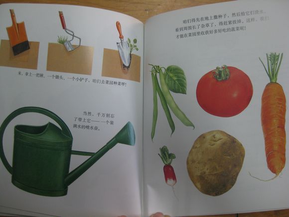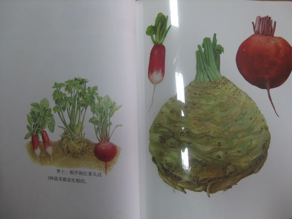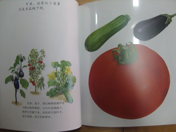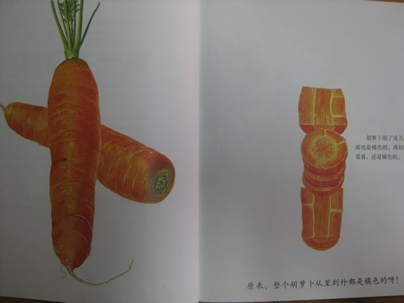 出版社:接力出版社 价格:13.8元 这是一套采用透明胶片双面绘画印刷的创新童书,在“透视眼系列”中,前一页是孩子平常用眼睛所见的现象,翻过透明胶片后,则是表现下的事物演变过程,让孩子亲眼见证、亲手探索、亲身体验,让孩子不但知道“是什么”,而且还知道“为什么”,从而培养孩子从小就能自己发现问题,解决问题的能力,启发高层次智能,培养孩子独立的人格,我家宝宝很喜欢这本书,她在听我讲的时候特别的认真,还让我反复给她讲。 胡萝卜削了皮儿,里面也是橘色的。在切开来看看,还是橘色的。 原来,整个胡萝卜从里到外都是橘色的呀! 胡萝卜是长在里面的,我们吃的胡萝卜其实是它的根。胡萝卜的也是从理论慢慢长出来,渐渐地,叶子上开出花来了,花里面结了胡萝卜的种子。这些种子再落到土里面,就又长出新的胡萝卜来啦。 瞧,这些东西都是用胡萝卜做的。你可以生吃,也可以让妈妈把它们做成菜。味道都很好。对了,你还可以喝胡萝卜汁儿呢。 胡萝卜可以把我们的身体养得壮壮的。 萝卜、根芹和红菜头这3种蔬菜都是吃根的。 这3种蔬菜既可以生吃,也可以做熟了吃。 菜园里面的好东西可多呢!瞧,你还可以找到芜菁、韭葱、洋葱。 做汤的时候放上一点儿,嗯,味道好极啦!不过要小心,生洋葱会辣你的眼睛哦! 土豆也有好多品种。为什么叫它们土豆呢?大概是因为他们就是一颗长在土地里面的大豆子吧。 把土豆放在水里面煮一煮,或者用油炸成薯条,都很好吃。 可是,还有好多蔬菜不是长在地下的。 比如:茄子、西红柿和西葫芦可不能去地里面挖,它们长在地面上,要把他们摘下来。你吃的不是也是,也不是根,是它们的果实。 四季豆、青椒和黄瓜也都是果实。 黄瓜和青椒切碎了,放在沙拉里拌一拌,味道怎么样?赶紧去试试吧! 你看得到它们的种子在哪里吗? 卷心菜和生菜都是长在地面上的。 你吃生菜的时候,吃的不是根,也不是果实,而是它们的叶子。 小豌豆和菜蓟也长在地面上。 你吃的不是根,不是果实,也不是叶子。 瞧,菜蓟就是一朵花苞。 小豌豆其实是植物的种子。 来,拿上一把锹,一个锄头,一个小铲子,咱们去菜园种菜! 当然,千万别忘了带上它——一个装满水的的喷水壶。 咱们得先在地上撒种子,然后给他们浇水。看得周围长链杂草了,得赶紧拔掉。这样,我们才能在菜园里收获好多好吃的蔬菜呢。 本作品未经作者许可不得转载,转载请征求作者意见。擅自转载使用,将保留追究其法律责任的权利! 评分记录