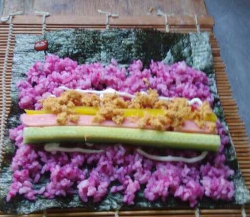 最后在寿司的卷帘上铺上紫菜片,将紫米饭放在紫菜片上,不要太厚,要不待会儿卷成紫菜卷的时候就会太厚了,不大好卷。铺紫米饭的时候留一厘米的位置,粘合的时候比较好粘合。接着铺上黄瓜条,火腿肠,酸菜条,蛋皮,肉松等,卷成紫菜卷。这时候卷的时候一定要卷紧一点,太松的话就容易散架。
