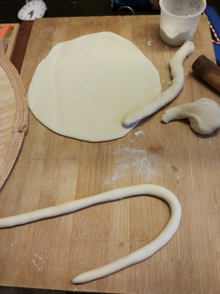 今天早上,我心怀忐忑的打开电饭煲,面团变大了呢,变软了呢,哈哈,一阵兴奋,看来畅畅的早餐有着落了啊。我加了适量食用碱面,一点点的水,一切还是经典的适量哦,使劲的揉搓面团,反复揉搓,白白滑滑的小面团真的是很舒服的赶脚,把面团分成四份,两大两小。