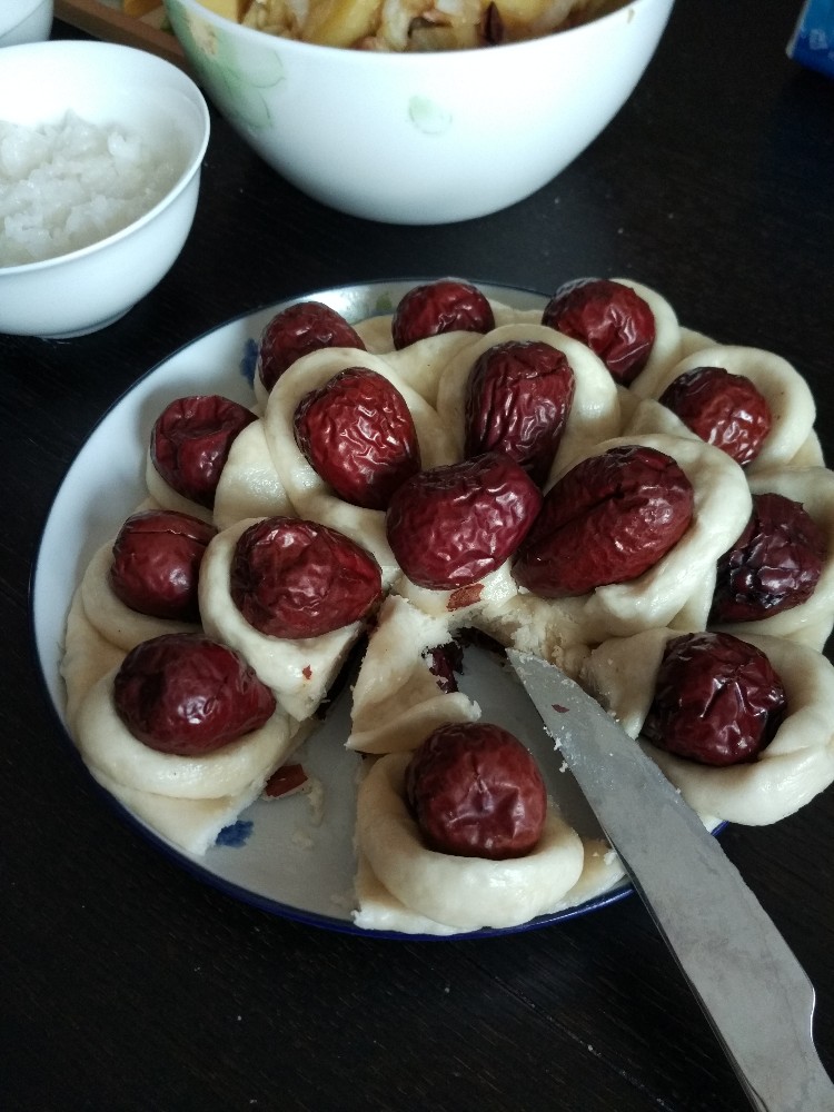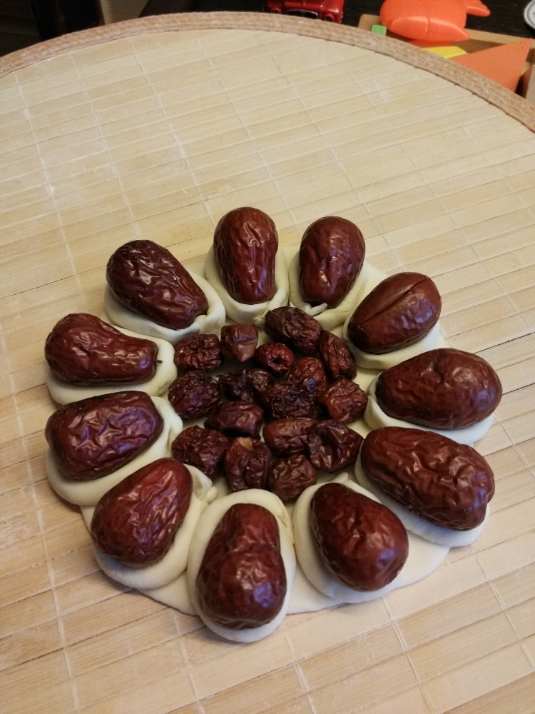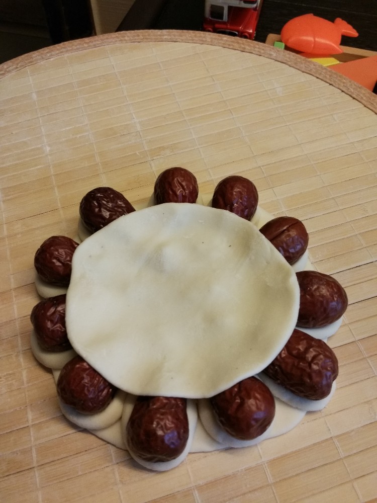 第一块大面团擀成圆形面皮,在上面中心位置摆放上无核的枣,我偷懒,买的时候就买了一袋无核小枣,哈哈。