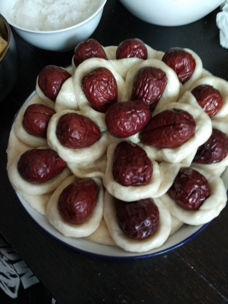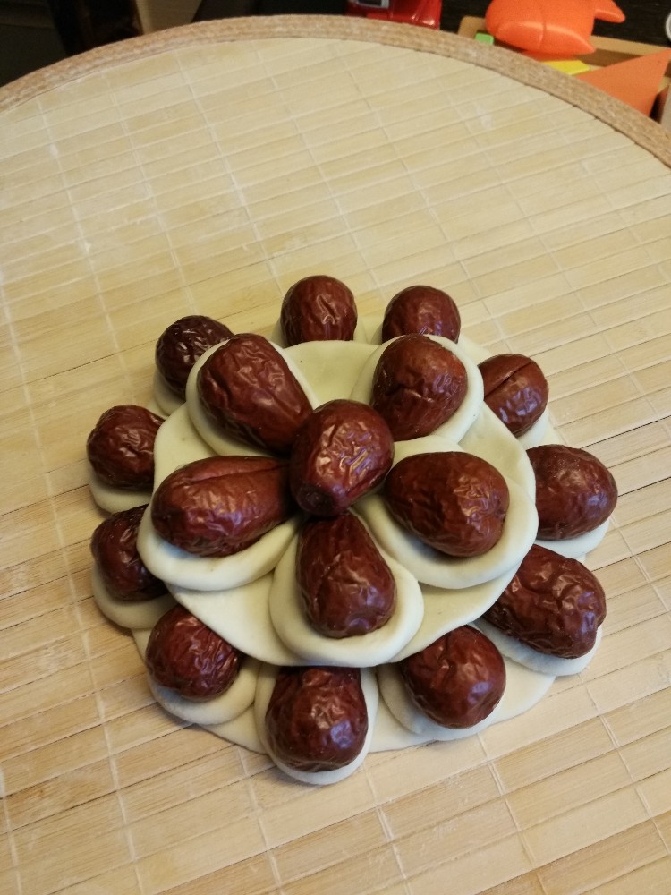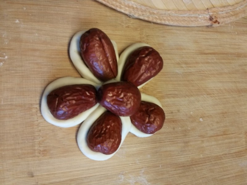 第二大面团揉成一条长条状,弯曲包裹一颗大枣,成一叶叶花瓣,摆放在第一块面皮旁边的位置一圈。
