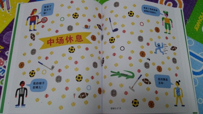 翻到书本的中间有一页是“中场休息”,是个运动小知识,让孩子在众多运动工具用提问的方式把它找出来,能在看书学习的同时把所学知识反复复习,能加深印象,这个游戏有开发智力的技能。
