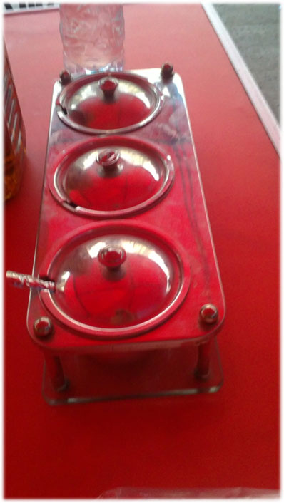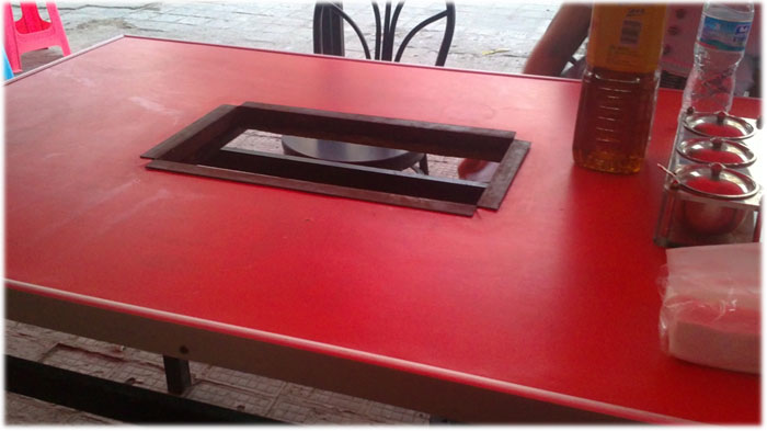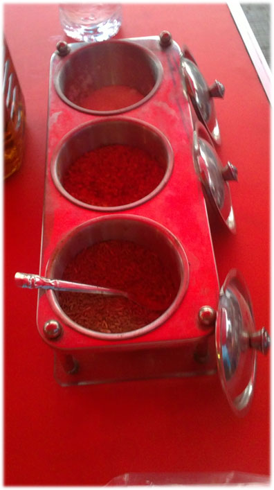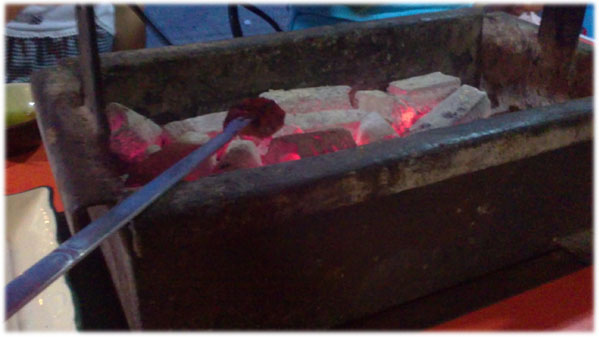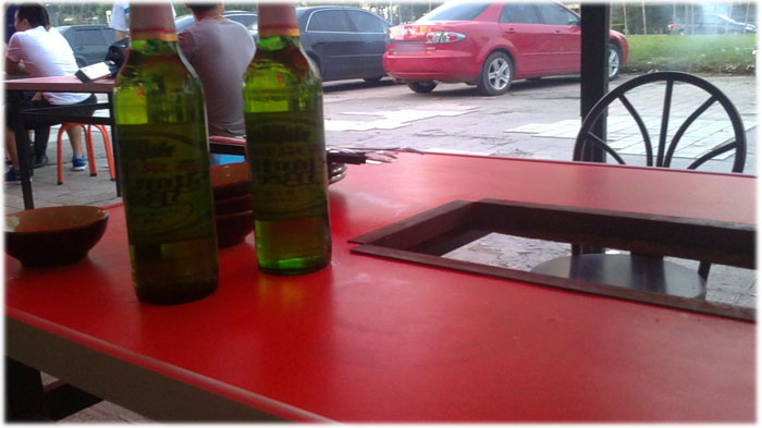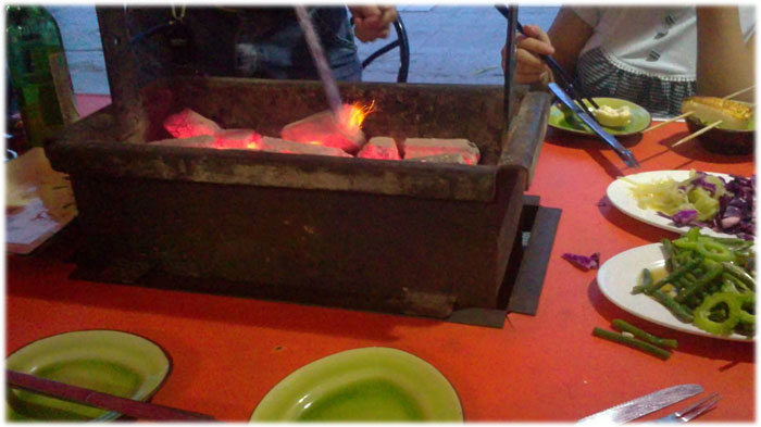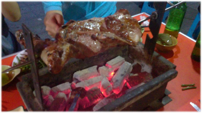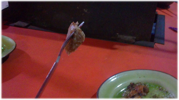 我们常去的这家店,就在我家附近,位于青塔西路最南边的一排小门脸儿,店名我不确定,但招牌上赫然写着“烤羊腿”三个大字,非常显眼(南北走向的马路,它坐落在路西边)。听老公说,这同一条街上再往北去,还有一家类似的店面,可味道却远不及这家香美~~我们一年四季都会来这边吃的,通常夏天时候会在室外搭上桌子,因为桌上有碳炉,很热!而到了冬天,大家都会通通挤到屋里去坐,几个朋友围坐在一起,守着桌上的碳火,一边取暖一边闲聊,还是蛮惬意的…… 每个桌上都会准备两套调料,每套包括三个小盒,里面分别装好了盐、孜然、辣椒面。这些照片是夏天去吃时拍的,头上顶着把红色的大太阳伞,映得照片里也满是红色,显得有些不太清楚。当时因为比较忙,一直没机会整理了发来,后来就把这组照片给遗忘了~~后来再去吃的时候,同行的人对我这个‘拍照控’显然有了些意见,不让我再疯狂的拍照片了。所以这次我就把以前的照片拿出来配上,反正内容都是差不多的,只是时节不太一样而已,大家将就看啊~~ 他家的喝水(酒)容器很逗,没有杯子,全都用碗,而且还是那种带个把的小磁碗,看上去有种复古的感觉~~老公超喜欢他家喝酒的这个碗,用他的话说“拿这碗喝酒,很有感觉啊!”……另外很重要的一点是,店家给每个人都会配上副刀叉,因为这个烤羊腿并不是店家烤好、切好、端上来的,而且是把整只的大羊腿直接架在火上,需要自己动手翻转、烧烤、并随时片下小薄片现烤现吃的…… 他家生意还算兴隆,虽然不需要排号,可每次去的时候在坐的人都不少呢。主要是那地界有些偏僻,知道的人太少,一般过去吃的都是些老主顾,更有专程跨区开车过来的~~吃这烤羊腿,千万不能心急,因为羊腿是被烤到四分熟之后,整只上来架在火上继续烤的。羊腿的重量不一定,可以自由选择,一般都在2-4斤左右~~ 羊腿摆上来,先不能急于动手呢,一定要耐心耐心再耐心的等待。烤一会儿,翻个过儿,再烤一会儿,再翻个过儿,如此循环,直至羊腿表面的一层肉先被烤熟。选个比较焦黄的位置,用刀子横向轻轻削下一个小薄片,用叉子牢牢叉住这小块肉,放在自己的小盘子里,根据自己需要兑好调料,用肉沾沾调料就可以吃了~~ 切记,手法一定要轻,切得一定要薄,因为羊腿很不好烤熟,如果削的太厚,就很容易吃到夹着红血丝的生肉啦!万一不小心削厚了、或者切到块还没熟的肉,可以用叉子架在碳火上继续烤烤。烤到自己满意为止,就可以拿回来沾上调料继续吃了~~等把羊腿上的肉,削得不能再削时,还可以要求服务员来把羊腿拆了。他们会将这烤好的羊腿拿到后厨,把肉从骨头上剔下来,然后连骨头带肉通通放在一个篦子上,重新拿回来。大家可以继续边聊边烤,把剩下的美味通通吃光光,这样就免去了一些不必要的浪费……