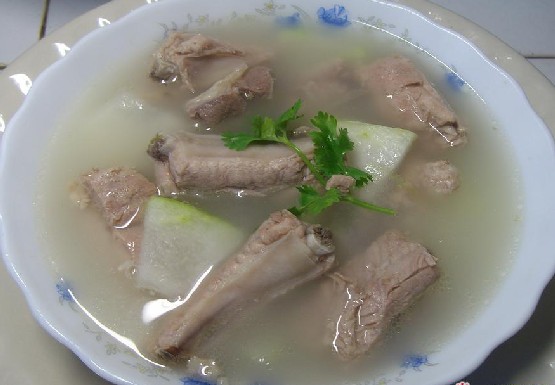 冬瓜排骨汤是一道家常汤,取料容易,制作简单,很适合冬天食用!在排骨汤中加入冬瓜还能起到清热、补气的作用。体虚力乏,腰酸腿疼的人尤其适合。风味特点、食疗食补作用:冬瓜入肾、膀胱,各人所需不同,大半取决于环境与体况,所谓“性相近,习相远,惟上知与下愚不移”。人的体质虽已形成于遗传与过去的成长,但是,日后的成长环境与习惯影响更大。湿热气对于人体,湿较多则伤肾,宜食冬瓜;热较多则伤心,宜食苦瓜。食瓜、豆、笋、姜不当都易伤肠损胃,调理煮食得宜才能取长期疗效,泄热散素、通利二便、补充钙质。材料:冬瓜200g,猪排骨100g,葱、花椒、食盐、香油、姜、、味精各适量。
