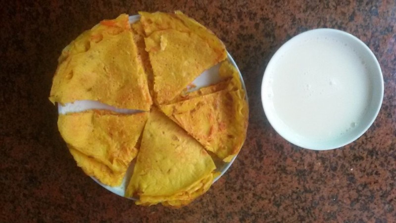 考虑到很久没做煎饼给小不点吃了,加上宝爸也刚好在家,然后我就琢磨着早上起来做煎饼了。看到冰箱里还有一根胡萝卜没吃,然后我就想做鸡蛋胡萝卜煎饼了。本来我是想做一块大圆形煎饼的,想不到自己经验不足,所以未等煎饼成型时我就急着翻面了,结果煎饼当然煎不了大圆形了,幸好只是一分为二而已,否则后面是很不好弄的了。 宝爸看到我这样做后,他就看不过眼了,就说他自己能做一个完整的煎饼,然后我就干脆交给他来做了。不一会儿,宝爸就真的做了一个完整的大煎饼出来了,看上去还蛮不错的,然后他又继续做煎饼了。就在这时,我发现宝爸放煎饼糊到锅里时竟然没有放花生油,当我告诉他时他才知道自己忘记放花生油了,虽然煎饼糊已经倒到锅里面去了,但我还是在锅边缘上加入一些花生油,总比不放的好吧。