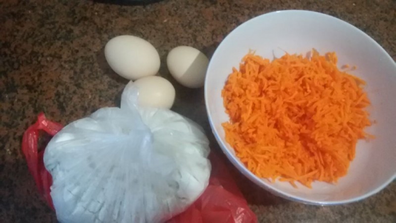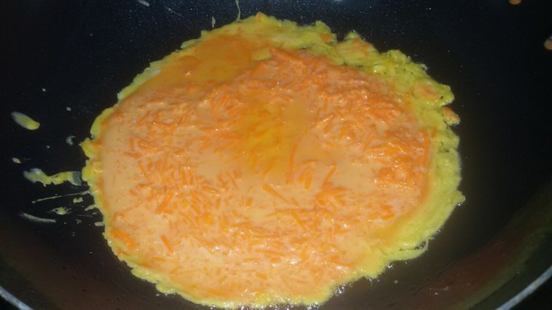 材料准备:胡萝卜一根(约150克)、鸡蛋三只、面粉适量 步骤: 1、胡萝卜去皮,擦成丝,备用; 2、鸡蛋去壳,把鸡蛋液打在大碗里,然后搅匀,再加入面粉、胡萝卜、食盐和水一起拌匀,备用; 3、不粘锅洗净,烧热,加入适量的花生油,倒入适量的煎饼糊慢火煎,煎至成型后再翻到另一面煎,饼熟即可出锅。