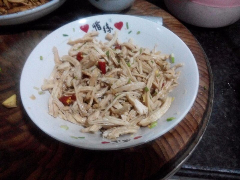 步骤:1.将鸡胸肉焯水,把水倒掉,然后重新装水煮熟(锅里放上几粒花椒,小片桂皮,一些盐); 2.把煮熟的鸡胸肉捞起来,放冷水里,如果有点冰块更好; 3.等鸡肉冷了,把鸡肉撕成条状,在碗里放好。上面铺上切成细末的大蒜子、生姜、干辣椒,切碎的小葱,花椒。 4.把锅烧热了倒入油,看到油冒一点热气就可以关火了。把热油淋到鸡肉上的那些调料上。 5.加入生抽,麻油拌匀,喜欢老抽也可以加点,喜欢吃得很麻辣可以再加辣椒油和花椒油。 味道非常的爽口,也可以用鸡腿肉做麻辣鸡丝,更有弹性一些。鸡胸肉的口感有一点柴。