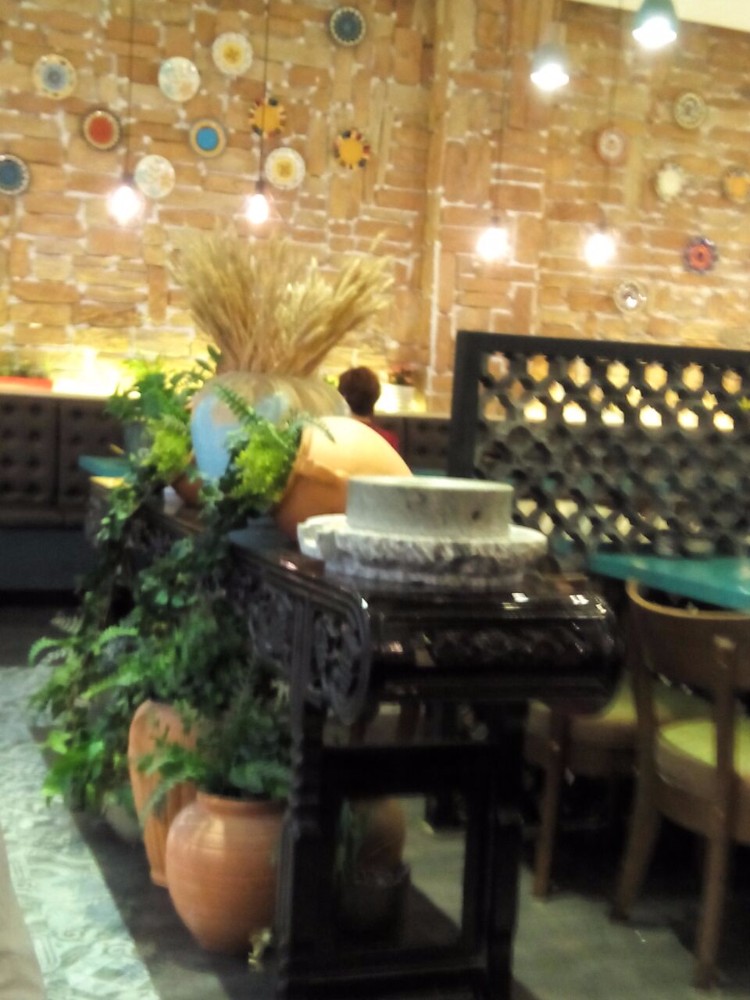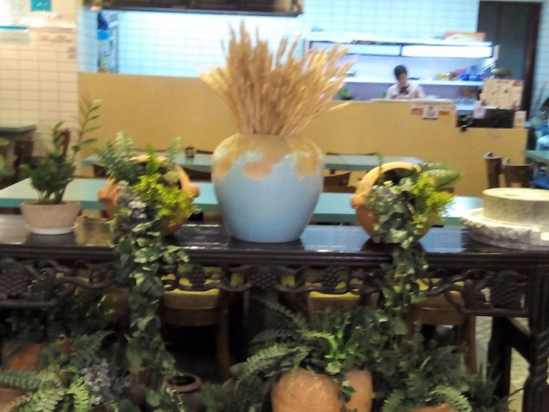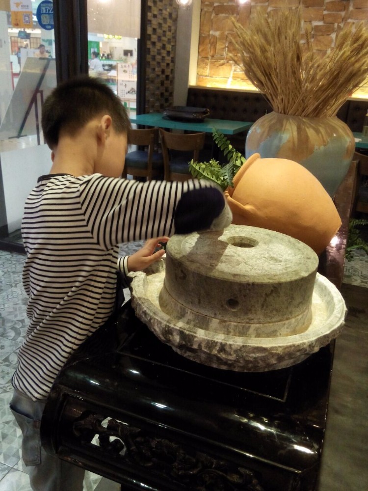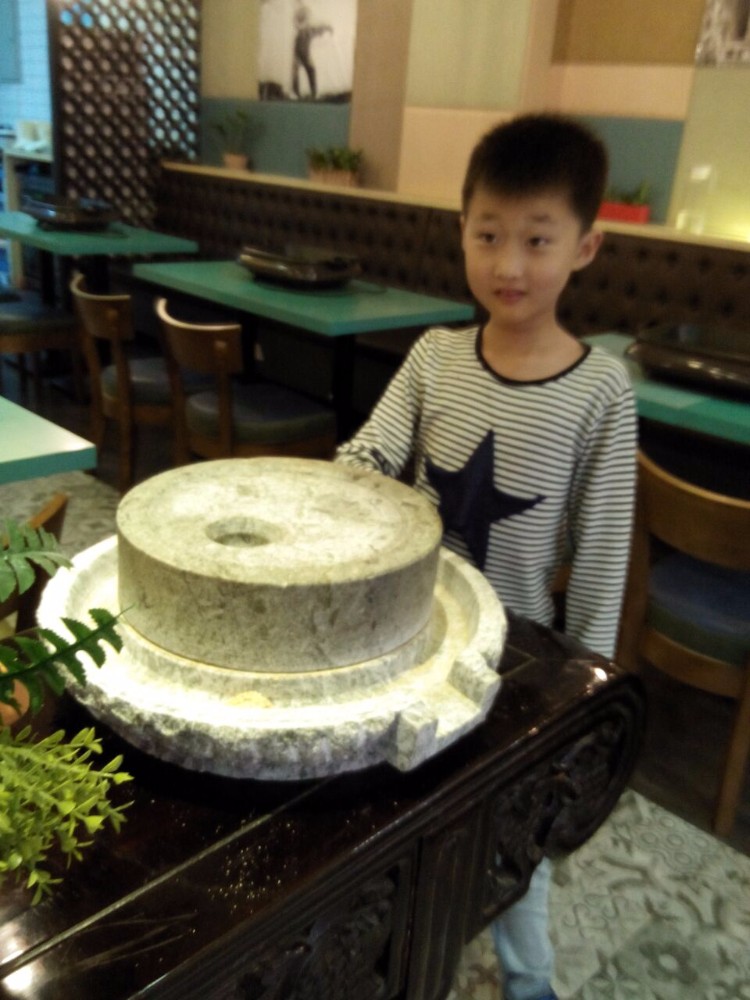 这个餐馆内的装修还是比较有特色的,门口就是一个磨子,可以磨米粉的,还有一些稻子小麦之类的装饰品,墙壁上也装饰有一些土家特色的饰品和图片。我们点了一个清江鱼,配菜有金针菇,娃娃菜,年糕,生菜,还送了米粉和米线。