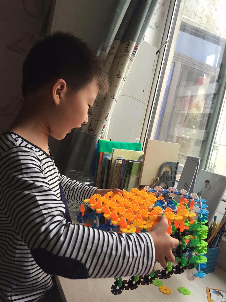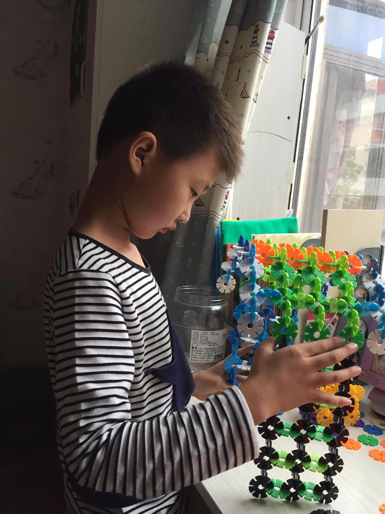 回家的时候开始下雨了,我们回到家已经十二点了,吃了一些午饭,下午雨挺大的,也没法出去玩了,点点就在家拼雪花片了。我让点点和妈妈一起睡午觉,点点不愿意,让妈妈睡觉,他自己玩雪花片。等我睡了一个小时醒来了,我去看点点是不是在看书,点点说没有看书,一直在拼雪花片的。