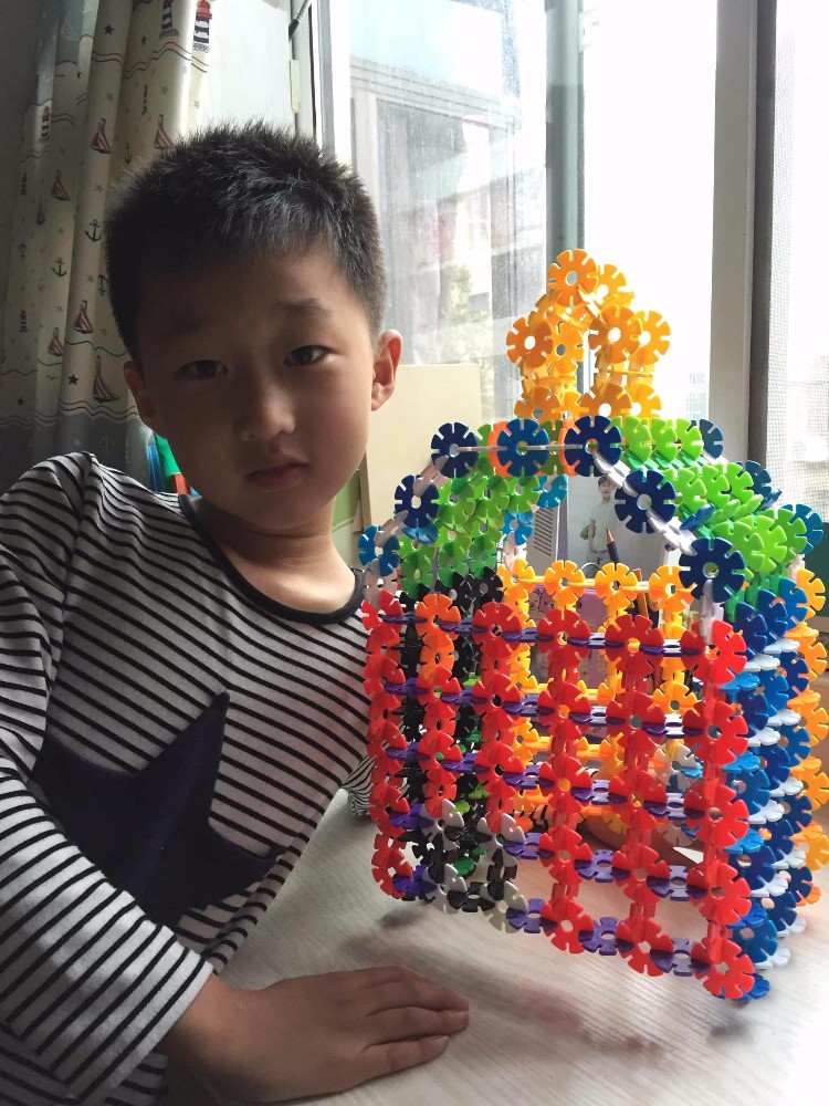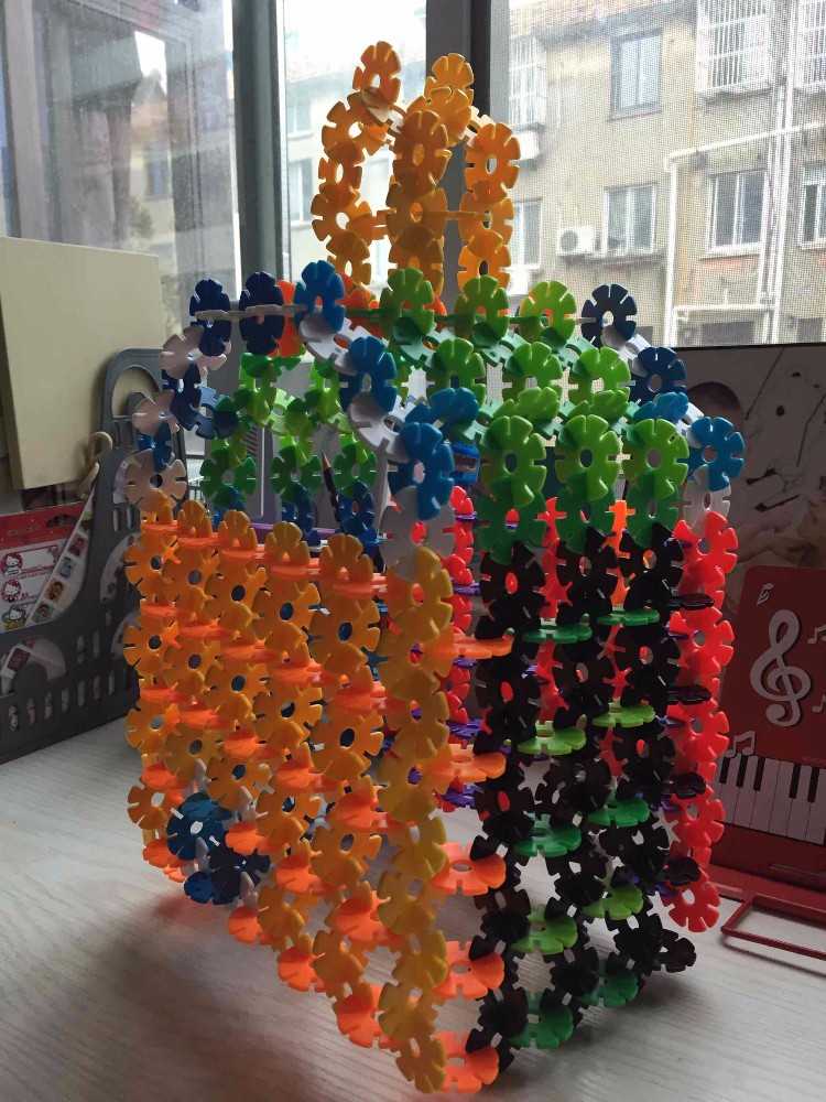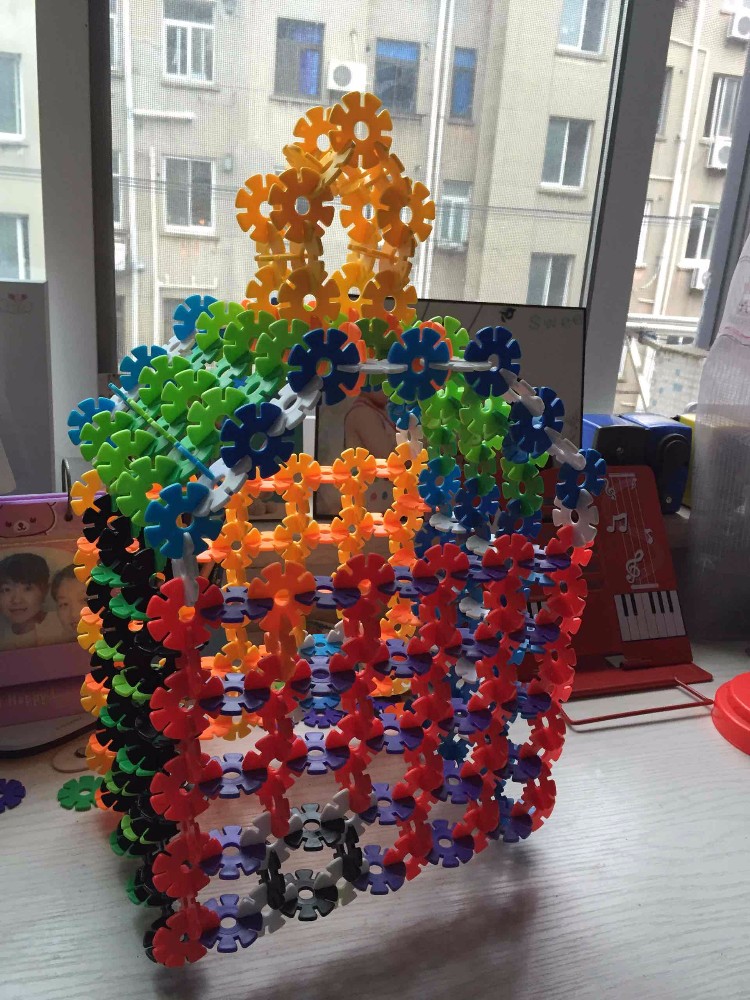 点点说这个大房子是他拼雪花片以来最大的一个,并且还注意了颜色的搭配,以前拼雪花片都不会注意颜色的搭配的,我们看看已经拼出的大房子,可以看出房子的门在哪里,还有房顶是一朵花的样子,很漂亮的一间房子呢。