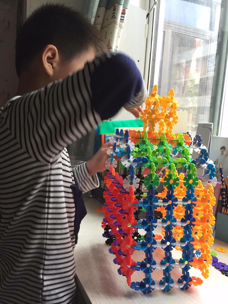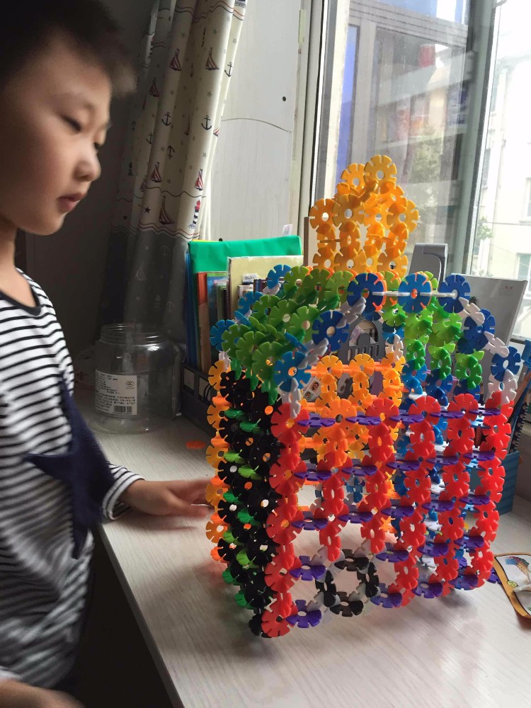 这时候点点已经拼了一个很大的房子了,每个房子的墙面已经拼出来了,然后在拼装每一个面,还不让妈妈帮忙,自己慢慢地拼着,又过了半小时,点点就拼出来一个大房子,几乎把所有的雪花片都用上了,看起来这个工程还是蛮浩大的呢。