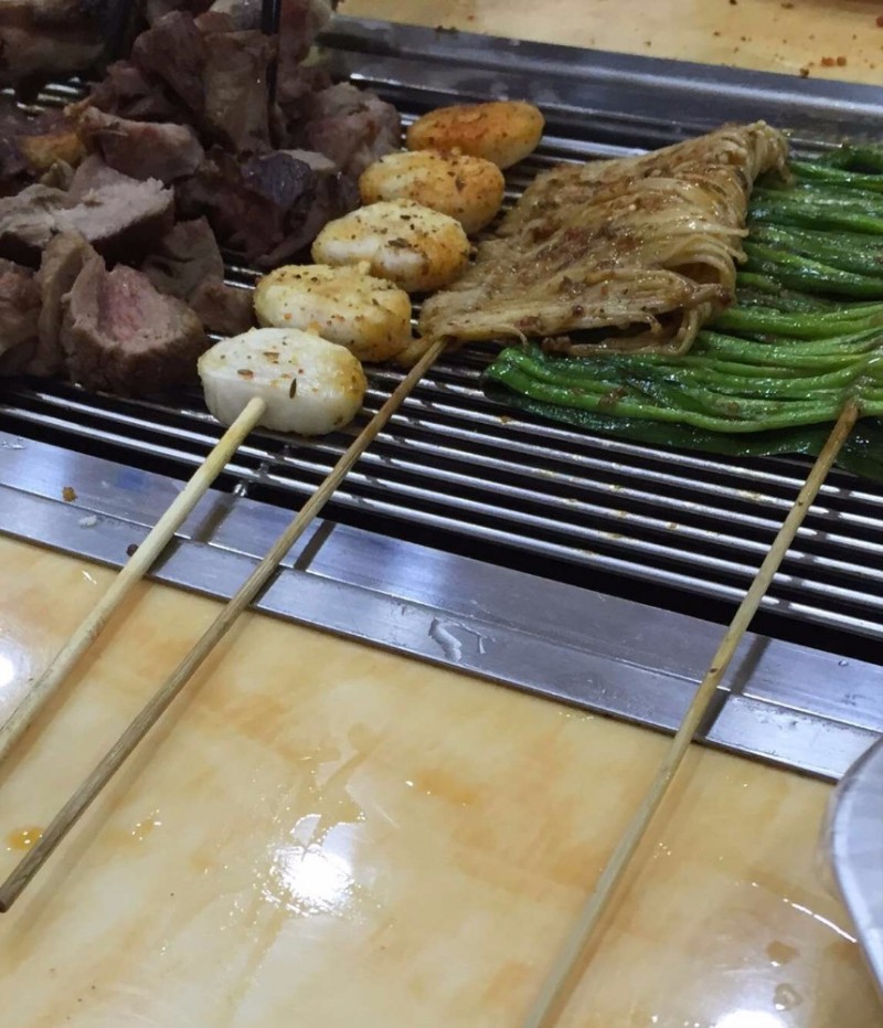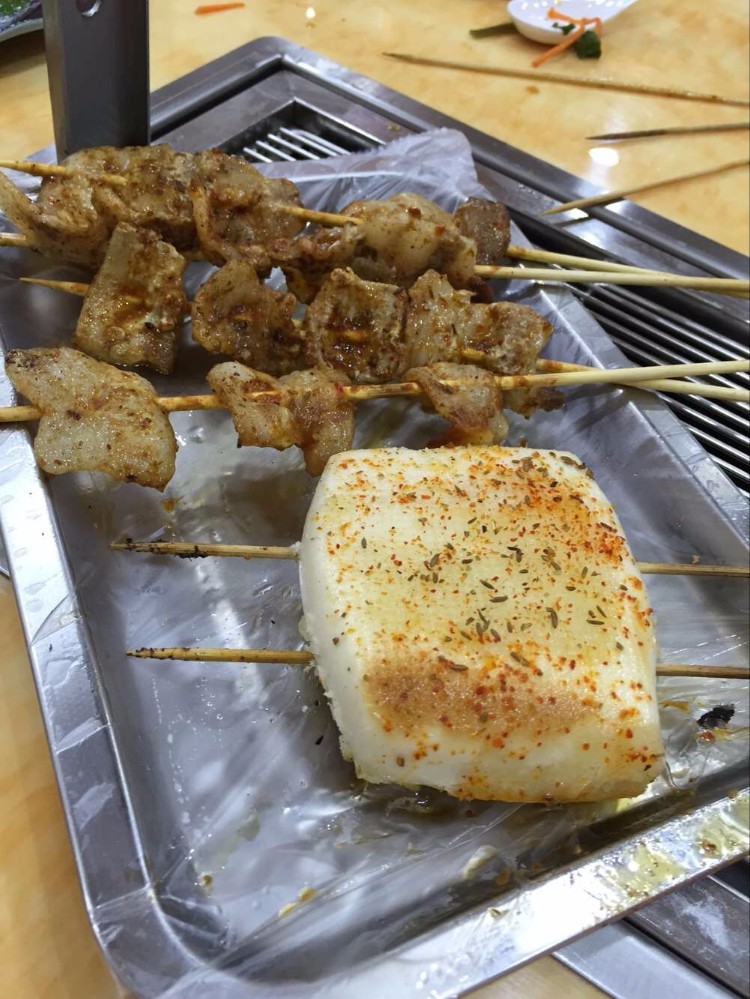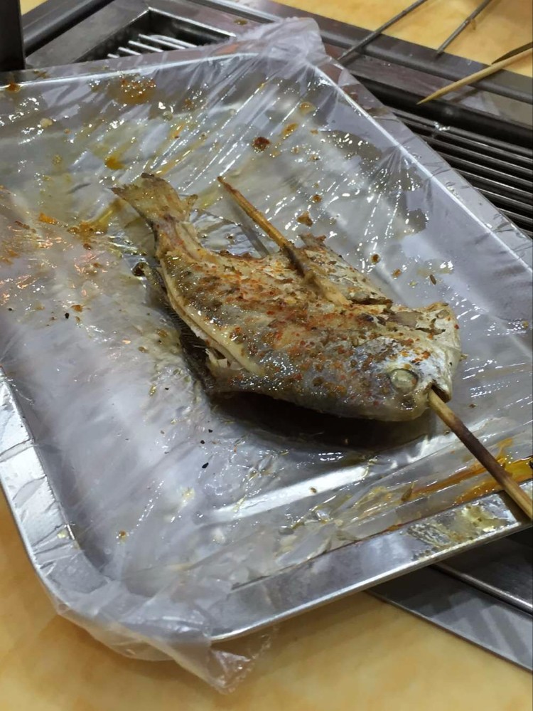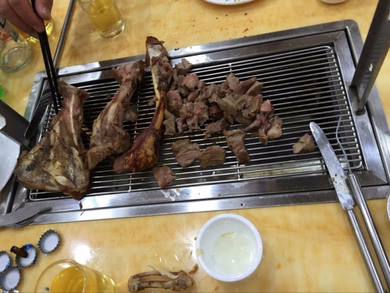 接着又上了一些烤的蔬菜,有烤韭菜,烤鱼,烤金针菇,烤馒头,还有烤五花肉和烤年糕,我都很喜欢吃,不过因为怀孕了不大好吃这些烧烤的东西,我就吃点蔬菜了,还吃了一些冷菜,羊肉很不错,我吃了好几块肉,最后剩下一个大骨头,再拿去烤一下了,烤完以后又切下很多肉呢,看起来这个羊腿真的蛮大的。
