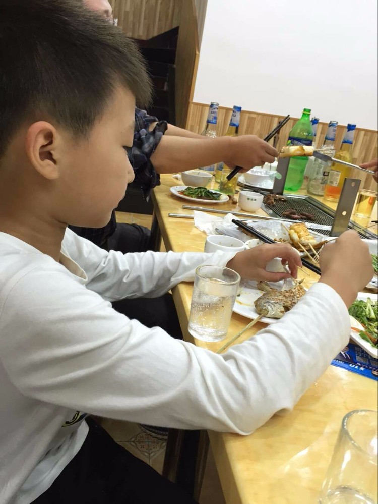 点点吃得还是挺多的,吃了好多羊腿肉,还需要很多调料,我说小孩子不要用调料也很好吃,点点说他就喜欢辣一点,才有味道。点点爸爸也是口味很重,吃得很辣了。我不能吃辣的,就吃了羊肉,没有放任何调料,并且也没有吃很多有调料的烤蔬菜。