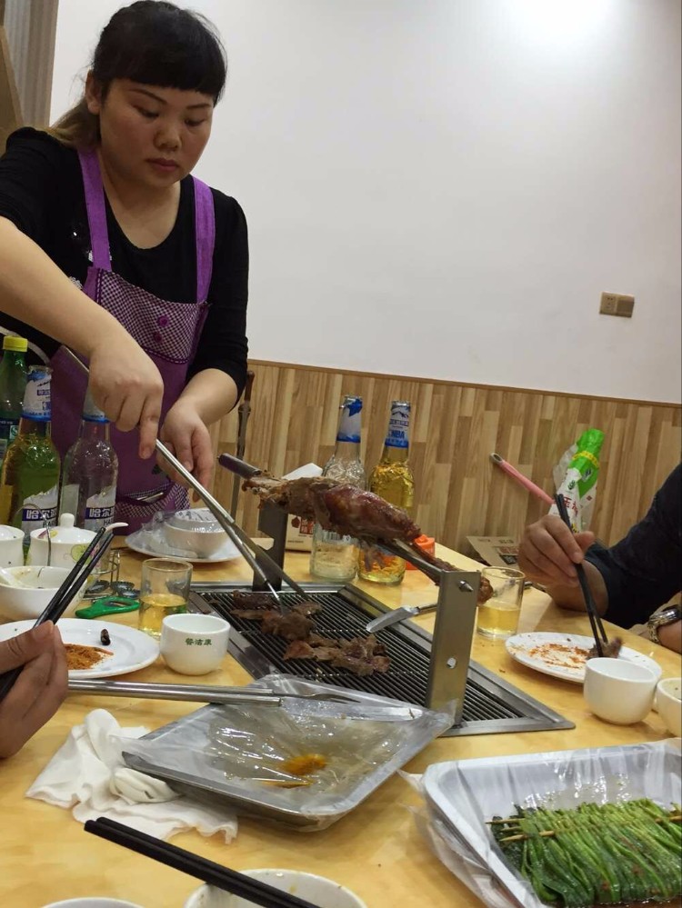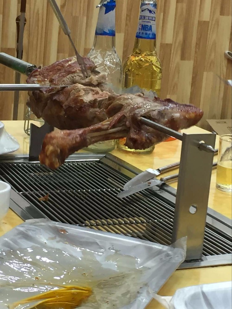 我们来到店里,因为是团购的内容,和店家验证了美团的条形码,所以上菜就很快了。先上了两个凉菜和花生,很快我们就等到了一个大大的烤羊腿,挂在烤架上面,一阵烤羊肉的香味飘出来了,外面的皮已经烤黄了,上面还有滋滋滋的声音发出来。点点爸爸用刀切起来,给了我一大块,我吃了一块,味道很不错,已经很熟了。然后服务员过来给我们切开来,一块一块放在烤架上面,我们吃的时候还是很热乎乎的。