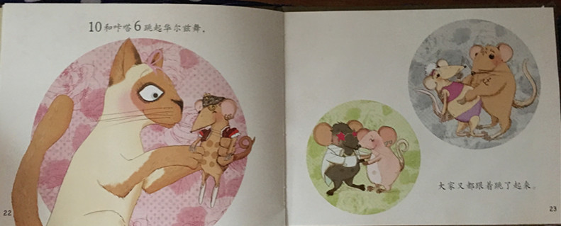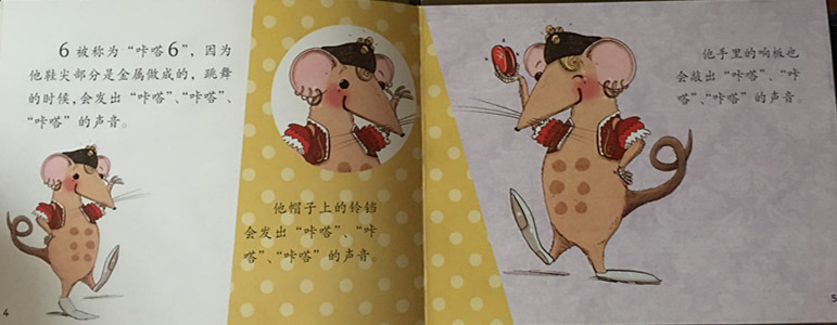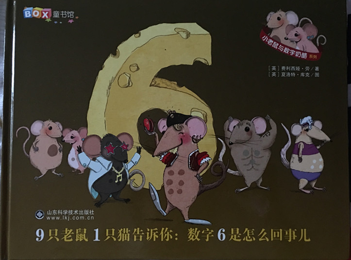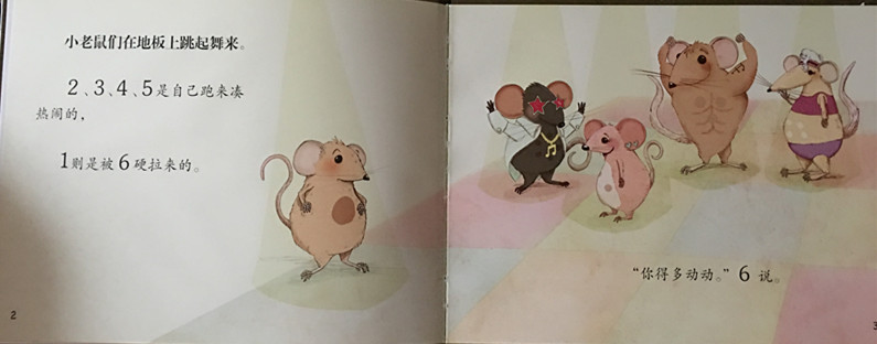 小老鼠教你认数字—读《9只老鼠1只猫告诉你:数字6是怎么回事》 by:洁yuanyuan 一读到这个名字,瞬间就特别感兴趣,老鼠和猫这对天敌也能教我们认识数字吗?这对冤家和好了吗?《9只老鼠1只猫告诉你:数字6是怎么回事》是小老鼠和数字奶酪中的一本,小老鼠不是最爱吃奶酪?这次小老鼠一定美美的饱餐一顿了吧!带着这种种的疑问,打开书,静静的读了起来。 书中第一幅画面中,左边一只胖胖的小老鼠捂着大肚肚站在聚光灯下,右边四只神态、身材、穿着各不相同的小老鼠聚集在一起,文字是这么描述的:2、3、4、5是自己跑来凑热闹的,1则是被6拉来的。数字用比文字更大的码号表示,原来小老鼠都是用数字表示的啊。 下一幅画面中就是小老鼠咔嗒6的特写啦。6一定是一位跳舞高手,穿着美丽的红色舞蹈服,那小身材也着实迷人。而他穿的鞋子也格外有特点,前面部分金属制作,总会发出咔嗒咔嗒的节奏声。6的舞姿很棒,还教给小伙伴跳加伏特舞、乡村舞、爱尔兰踢踏舞……大家跳累了,可爱的大胖猫登场了,给每个人制作了一杯鲜橙汁,帮助大家恢复元气,并且和小老鼠们跳起了舞,真是一场快乐玩耍的场景啊。老鼠和老猫也变成了好朋友~~ 这是一本可爱的绘本,有趣的故事,鲜明的角色,包括数字都是在无形中传递给孩子的,让孩子们快乐的学习~~