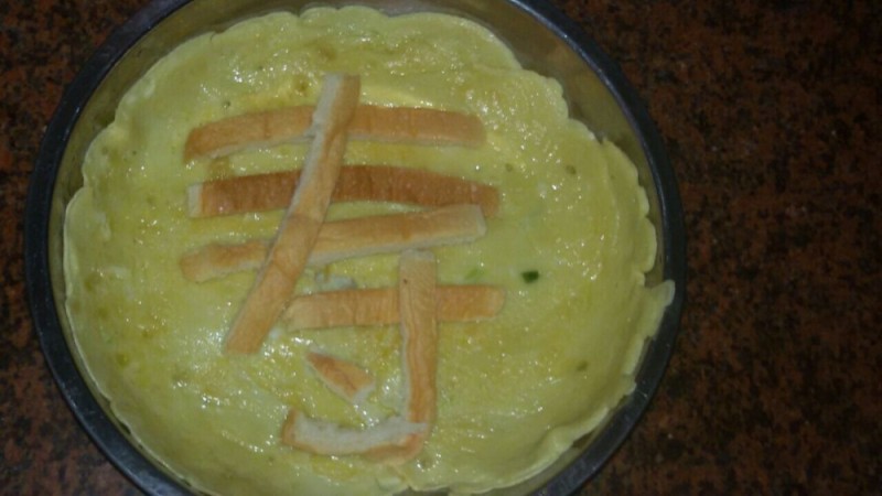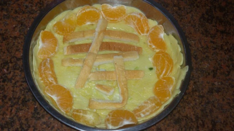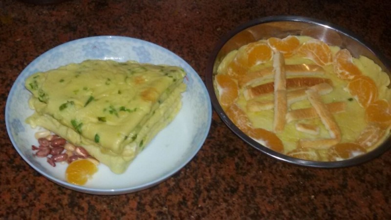 看,这就是我做的葱油饼(鸡蛋煎饼)了,经验不足,煎饼看上去有点厚,但味道还是不错的,大家都很喜欢吃。 考虑到今天是宝爸的生日,所以我就想摆一个造型来表达一下自己的心意,可思来想去,我也不知道如何摆盘。后来看到冰箱里还有小不点吃剩的几块方包片,然后我就想利用方包片的边条在煎饼上面摆一个“寿”字了,算是对宝爸的生日祝福了。祝今天的寿星身体健康,寿比南山! 想到早餐要吃一些水果,家里就只剩下桔子了,然后我就把桔子剥开,然后一瓣一瓣地放在盘边,一是为了衬托“寿”字,点缀一下;二是为了让大家早餐都吃些水果。