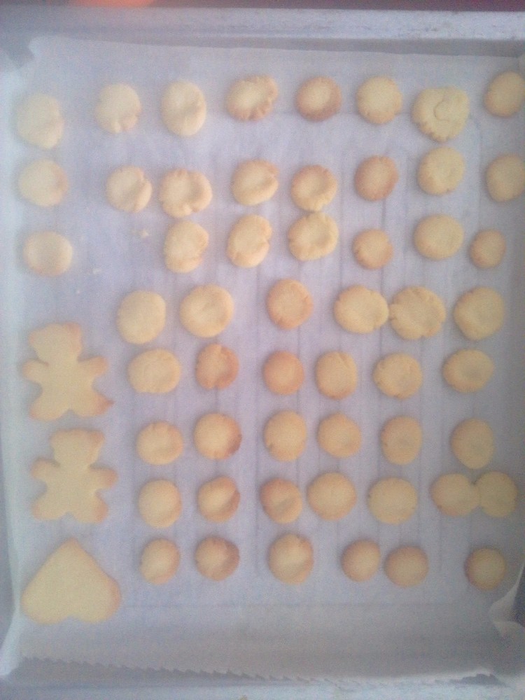 在烤盘上面放了油纸,然后按顺序一个一个的放上去就可以了,上下170度烤的,本来位置不同,饼干不是一起烤好的,大概5分钟之后就要随时观察,把烤好的提前拿出来,不然就烤糊了,我一开始不知道,烤的比较糊,后来颜色是越来越好看。后来我看面比较多,也懒得一个一个的卡模具,就直接做了拇指饼干,这个比较简单,揉成一点大的圆球放在油纸上面,然后用大拇指在中间部位按下去就可以了,非常的好吃。