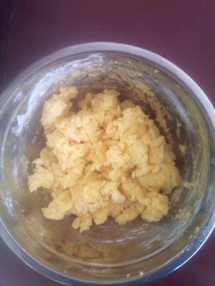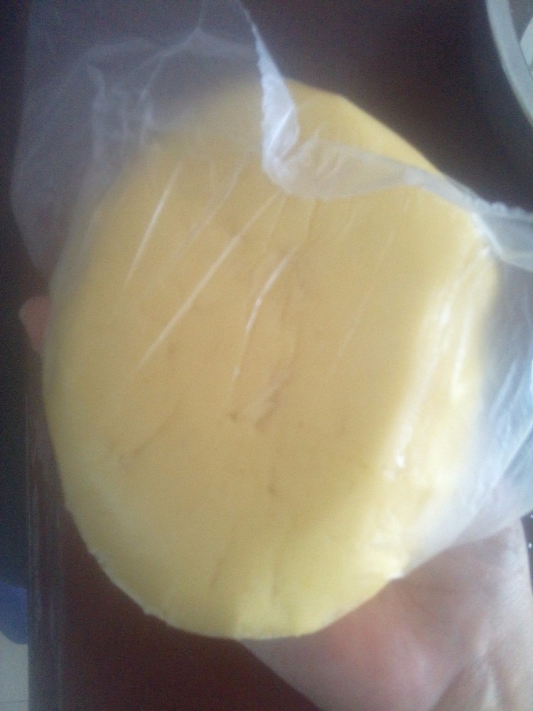 完全融化的黄油加入糖粉,搅拌均匀后,加入鸡蛋,这个就是要不停的打发了,本来是我打发的,被我妈嫌弃了,说是我这动作不标准,一看就不是经常下厨的人,嘿嘿,然后就是我妈打发的,没有用电动打蛋器,就用的普通的手动打蛋器,一直打发到搅拌不动为止,也就是比较粘稠的那种。然后倒入面粉里面,和面,这个过程是不需要用水的,看到面团表面比较光滑之后放入保鲜袋,进冰箱就可以啦。
