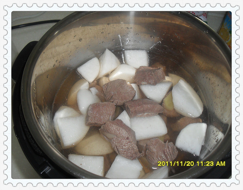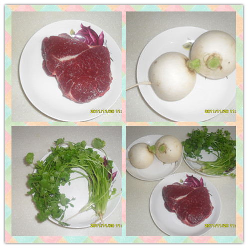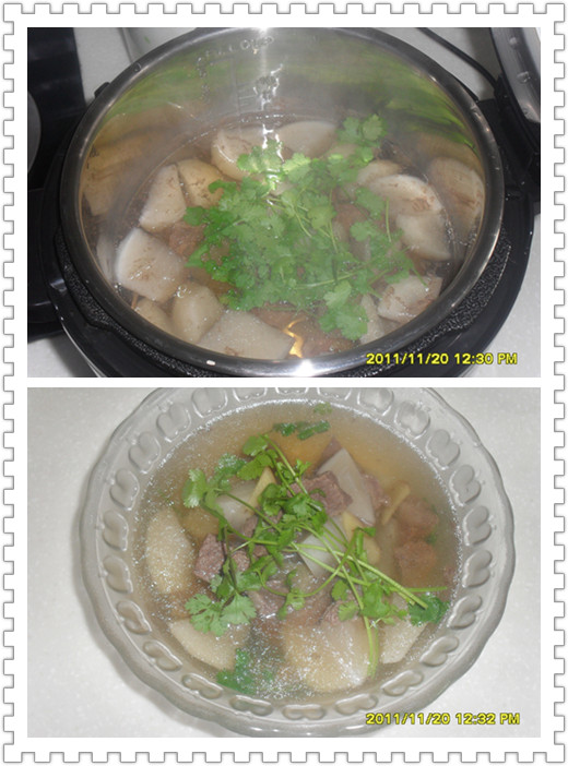 俗话说:“冬吃萝卜夏吃姜,不劳医生开药方”。萝卜有消食化痰定喘,消热顺气,消肿散淤之功能。牛肉也含有丰富的锌,蛋白质,脂肪,碳水化合物,钙,磷,尼克酸等营养成份。而且牛肉也特别适合在冬天吃。天渐渐的转冷的,我跟儿子前段时间感冒咳嗽刚好,来碗萝卜牛肉汤,除了补补还可以抵御风寒,预防生病。 平日里我跟老公都上班,烧菜煮饭的活都是婆婆给我们做的,周末在家想到了前几天逛超市新买的电压力锅上有煲汤的功能,就用它给大家煲一份萝卜牛肉汤吧。 做汤材料:白圆萝卜,牛肉,香菜。 萝卜牛肉汤的做法: 1.牛肉洗净切块放锅中,加热水姜片焯一下,去血丝备用。(我喜欢切大块的这样烧好后牛肉吃起来比较有嚼劲) 2.萝卜洗净去皮,切块。 3.香菜洗净切段。 4.把焯好的牛肉跟萝卜一起放进锅内,放上几片姜片,料酒,加适量的水(按自己喜欢,我家比较喜欢吃汤我就多放点水),盖上锅盖,就等着电压力锅“嘀嘀……”的叫了 5.出锅放上调料和切好的香菜。 6.准备开吃。 这汤即营养又鲜美,还不油腻。儿子可喜欢喝了,喝了满满一碗.老公也说好喝很鲜。 本作品未经作者许可不得转载,转载请征求作者意见。擅自转载使用,将保留追究其法律责任的权利! 评分记录