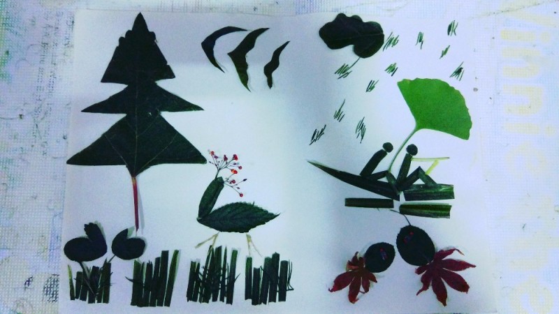 画面的右半边好像有些活力了,这左边便也得不够生机勃勃,必须也要让左边动起来!松树旁来一片草坪吧,此时我正好看到了采集来的“人参种子”,这不正适合做美丽的“鹿角”吗?鹿脚正好可以用一种野草的鸡脚式的种子!于是松树旁一只悠闲自得的小鹿就出现了!为了彰显人与自然更和谐的一面,我又加上了两只小兔,只是其中一只顺着一种野草叶的形状剪成,较为相像;另外一只却似乎少了一些精气神儿!就这么凑活着吧! 最后,为了让左右两部分更好地衔接到一起,我连制作过程中的“下脚料”也不放过,我利用刚刚的下脚料做成了三只大雁,试图让整个画面关联性更强!至少我是这么认为的!本来还想着鱼塘的周围再围一圈儿的,可又觉得那会不会有些画蛇添足的意思?画面会不会有种隔离感?不妨就这么简单地放着吧! 看着我们的大作,我和小家伙都很满意,可当我把一晚上的“杰作”展示给宝爸看的时候,想不到他第一句话竟然是:“这两只鱼够大,能把这两个人吃掉了呢!”看来男人和女人真是不同的物种呢!男人的思维里总少不了科幻恐怖的成分!