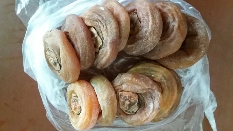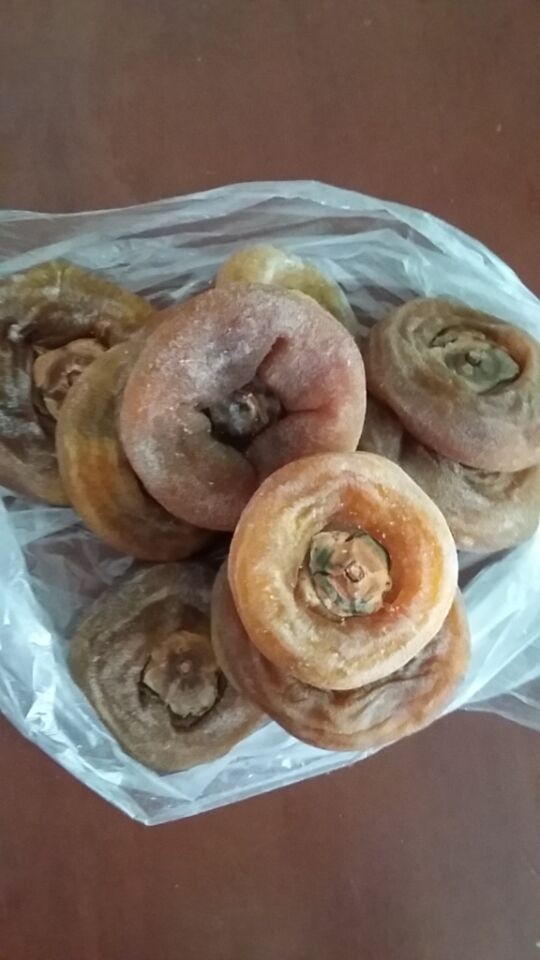 有些人看到杮饼最上面有一层白白的、像面粉一样的,以为是发了霉的杮饼,其实不是,而是杮霜,是杮饼的精华,有降血压、清热润肺、止咳、敛肠止泻等功效,所以食用时不建议把它都弄掉。 看,这些就是我买的杮饼了,虽然个头不大,但味道还是不错的,味道甜润而绵长