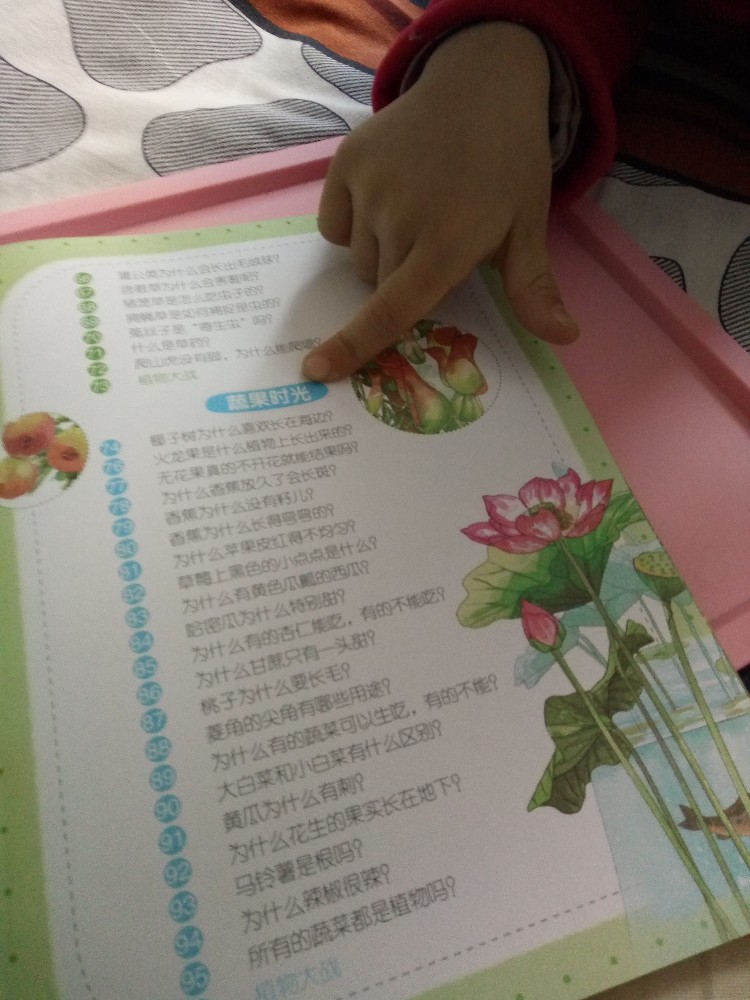 北斗童书出版的这套十万个为什么,与时俱进,画面精美。有幸得到了试读机会。昨天收到就迫不及待跟女儿读了起来(妹妹好乖,自己睡着了,我和女儿才有了闲暇) 我家大女儿五岁,上大班,能认很多字,有的地方可以自主阅读。生僻字有拼音标注,女儿指着拼音,问我,这是字母吗,我说不是,是拼音,等你上了小学就会学到了。 翻到目录,我问她,咱们先看什么,她指指蔬果时光。