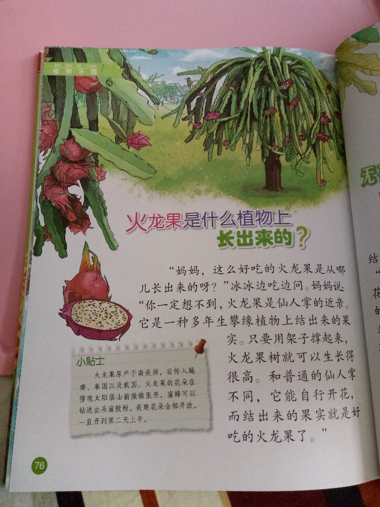 我们昨天刚吃了火龙果,我让她提问,我来回答,尽量说的白话一些,自然一些,就像平时聊天一样。她的注意力更多的在精美的图片上,我解释完,她好像明白了,说“哦,原来火龙果是这样长出来的。