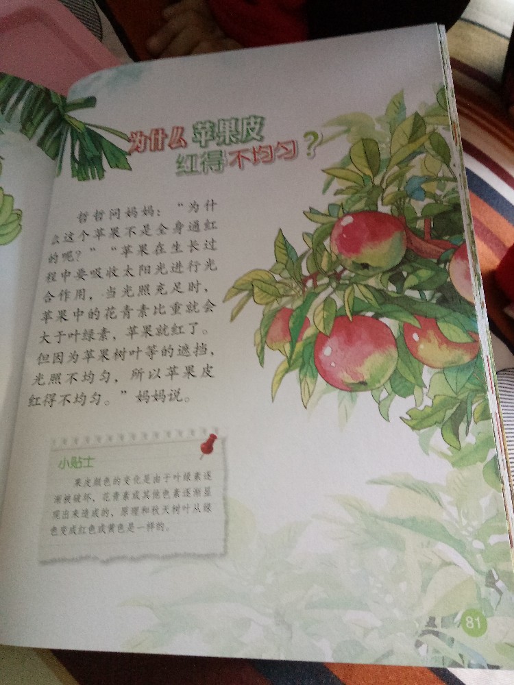 讲到苹果的时候,我们拿出来一个大苹果,女儿看看苹果,看看书,问我,为什么有的地方红,有的地方不红呢。 然后我们从书中找到了答案。原来是阳光照射的问题,我们学过生物,脑子里可能会想到光合作用啊,叶绿素啊什么的,可是孩子不明白啊。书中说,是因为阳光照射不均匀,所以红的不均匀,这样就白话很多,孩子容易理解