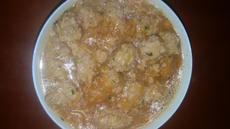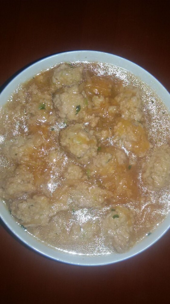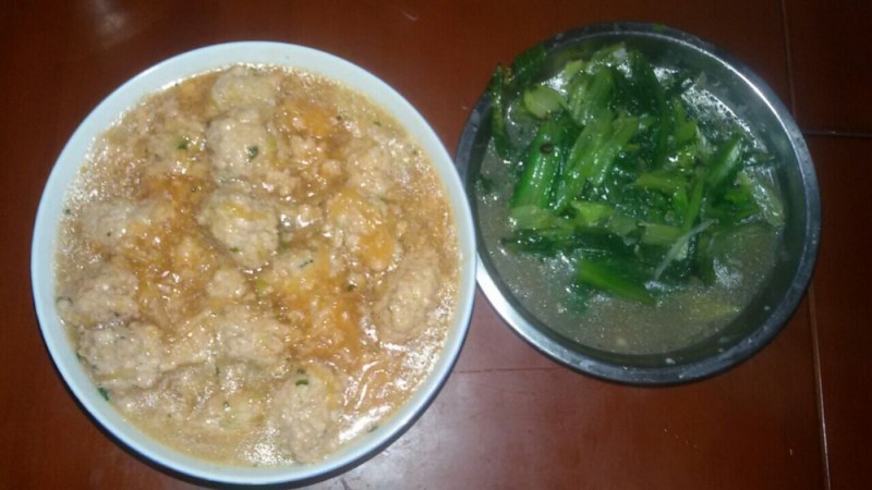 看,下面这个就是宝爸做的白萝卜丝猪肉丸了,我吃第一只肉丸的时候觉得特别的香,甘甜可口,满口溢香,想不到吃第二只的时候我却猛扒饭。宝爸看到后就问我怎么回事?然后我就实话告诉他,他煮的萝卜肉丸太咸了,估计是放盐放重复了,然后他才想起刚才煮菜的时候在与人聊电话,聊工作上的事情,所以才忘记已经放过一次盐了吧。