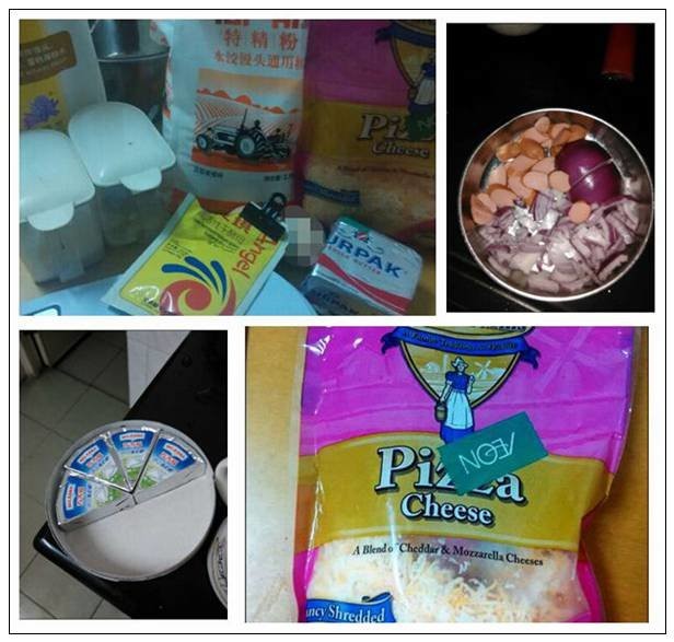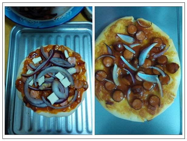 陷料:一般用马苏里拉芝士,可是我看了荷氏农场区萨碎,这个价钱和效果也是差不多,香肠,洋葱。 酱汁:洋葱,番茄酱,黄油,鸡粉,盐适量。