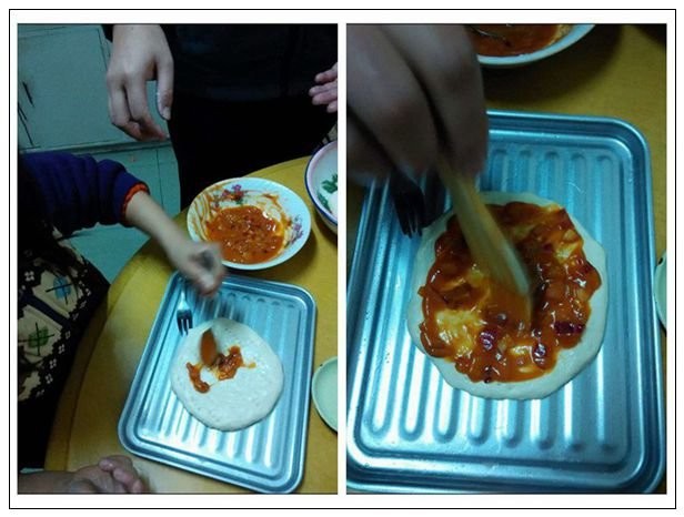 5. 把煮好的酱汁均匀涂在彼萨皮上,这个也是大宝来完成,我协助。